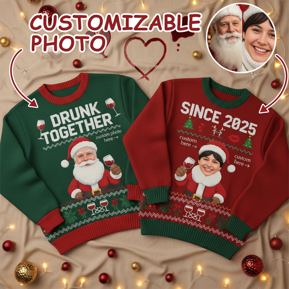 Drunk Together Christmas Ugly Sweater – Customizable Photo Santa and Elf Jumper, Funny Holiday Wine Sweater for Xmas Parties | Ugly 63