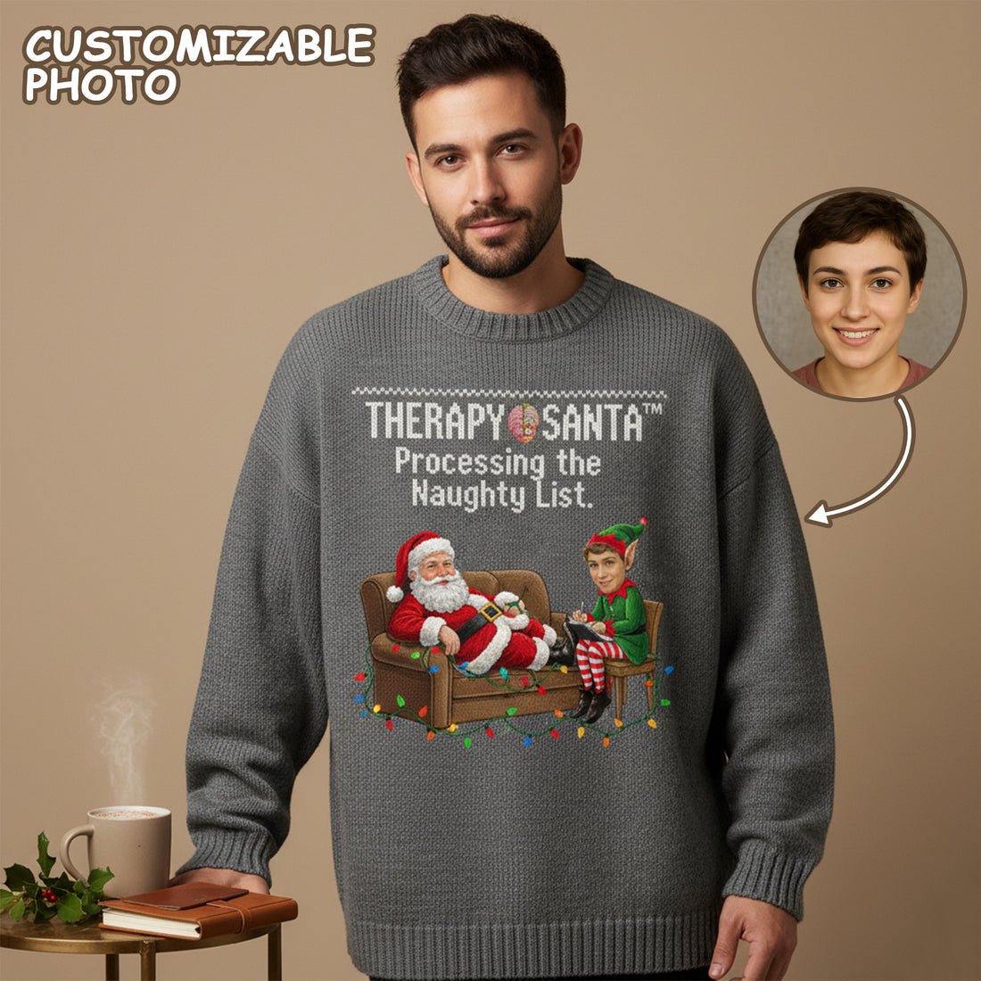 Custom Photo Christmas Sweater, Funny Therapy Santa Ugly Sweater, Processing the Naughty List, Personalized Xmas Gift| Ugly 47