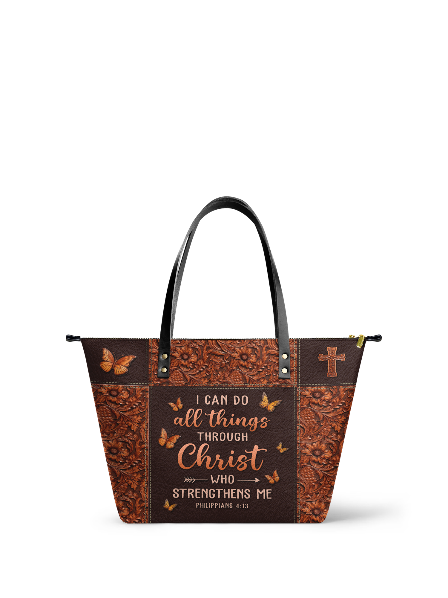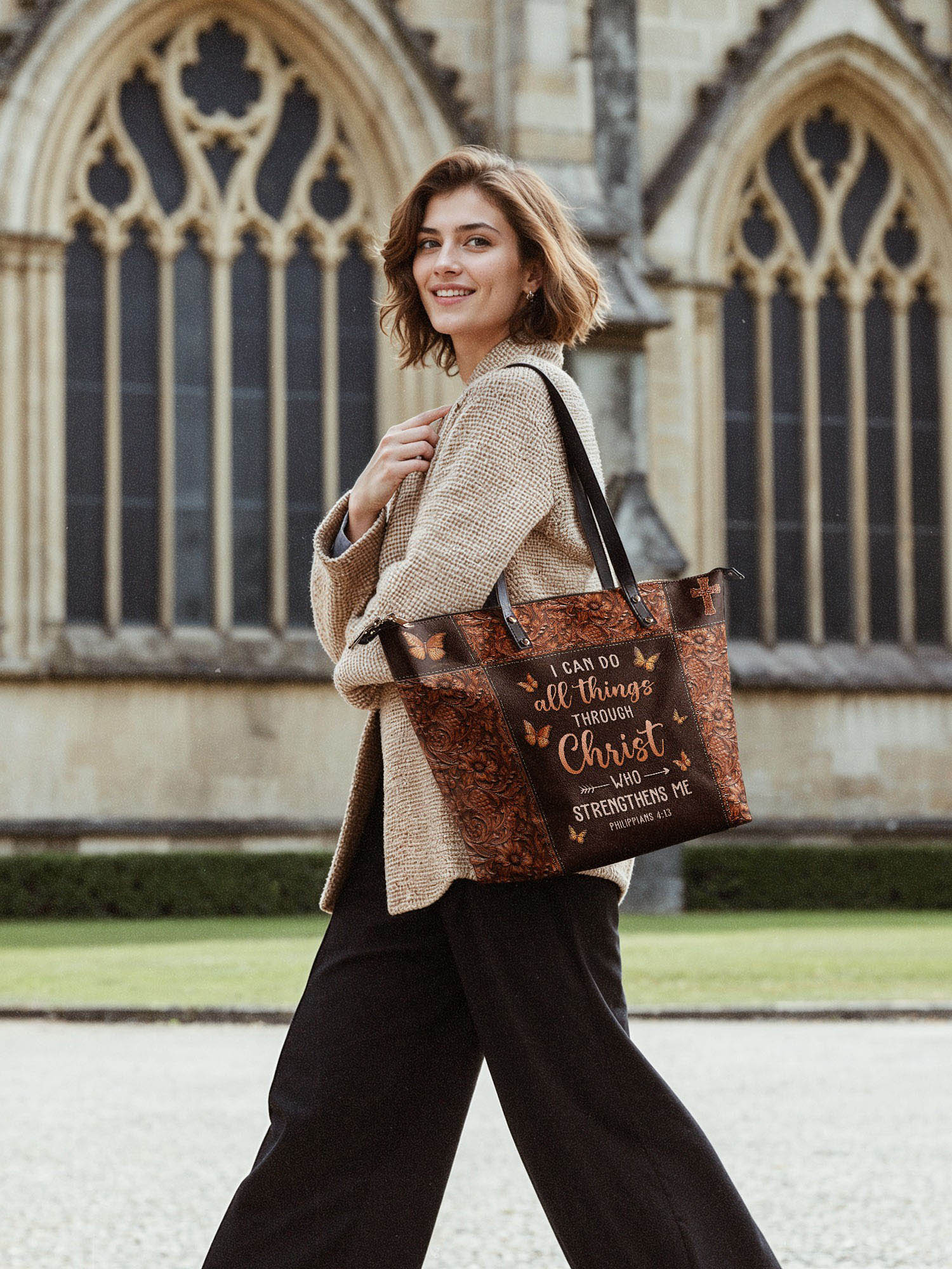 "Believe" - Philippians 4:13 Leather Tote Bag