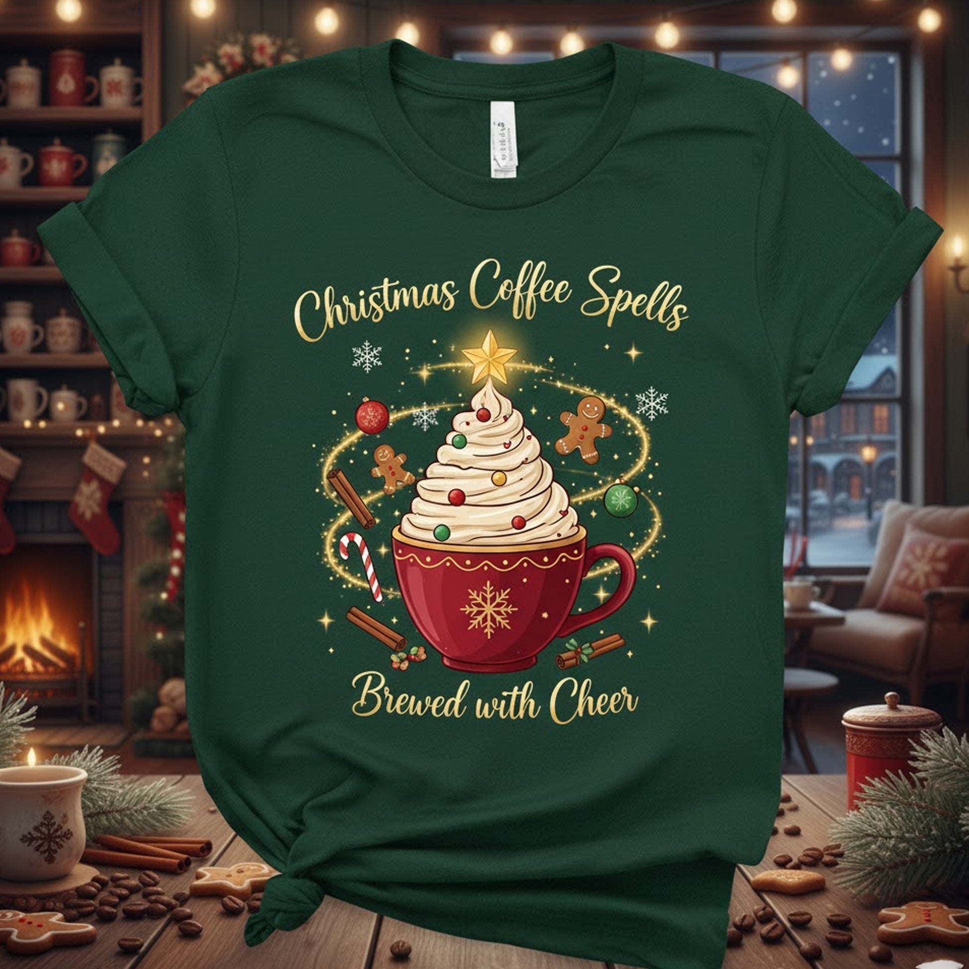 Start your mornings with holiday magic in our Christmas Coffee Spells Brewed With Cheer T-Shirt! ☕