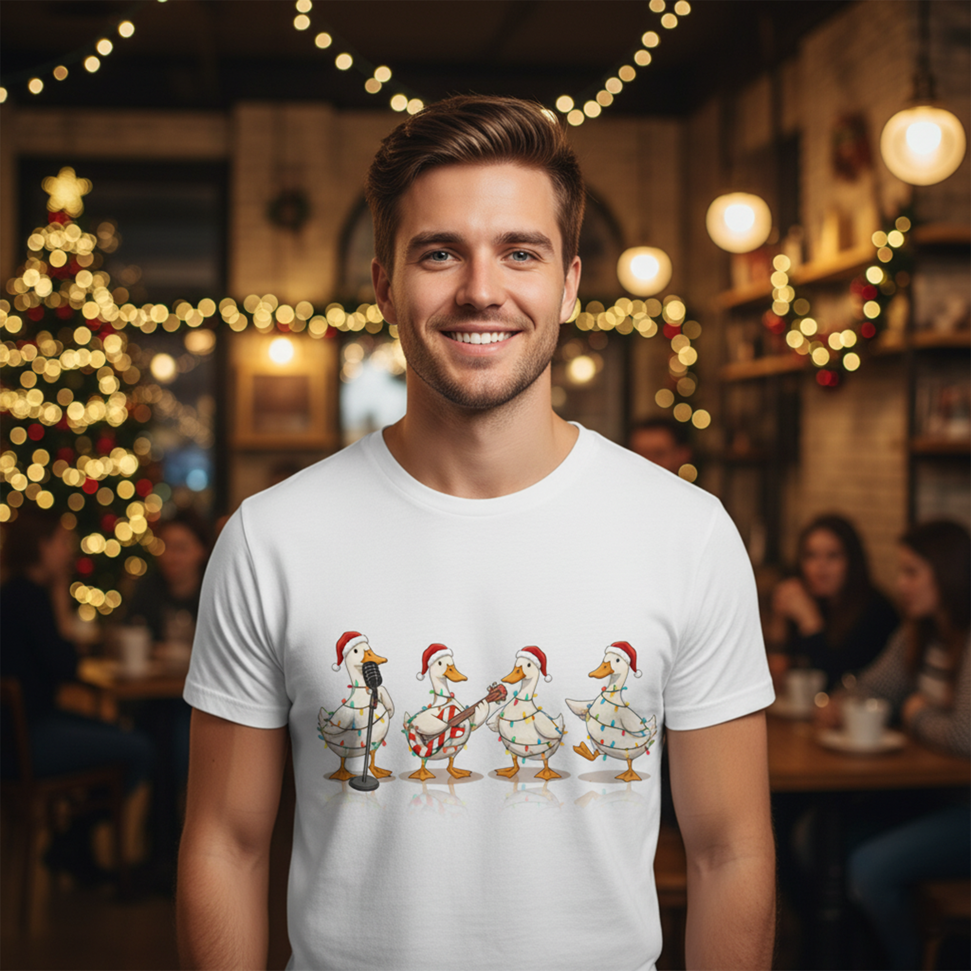 Get ready to quack up this holiday season with the Christmas Ducks Band T-Shirt! 🦆This adorable design features four ducks wearing Santa hats, wrapped in Christmas lights, and playing instruments — the perfect shirt for anyone who loves humor and holiday spirit.
