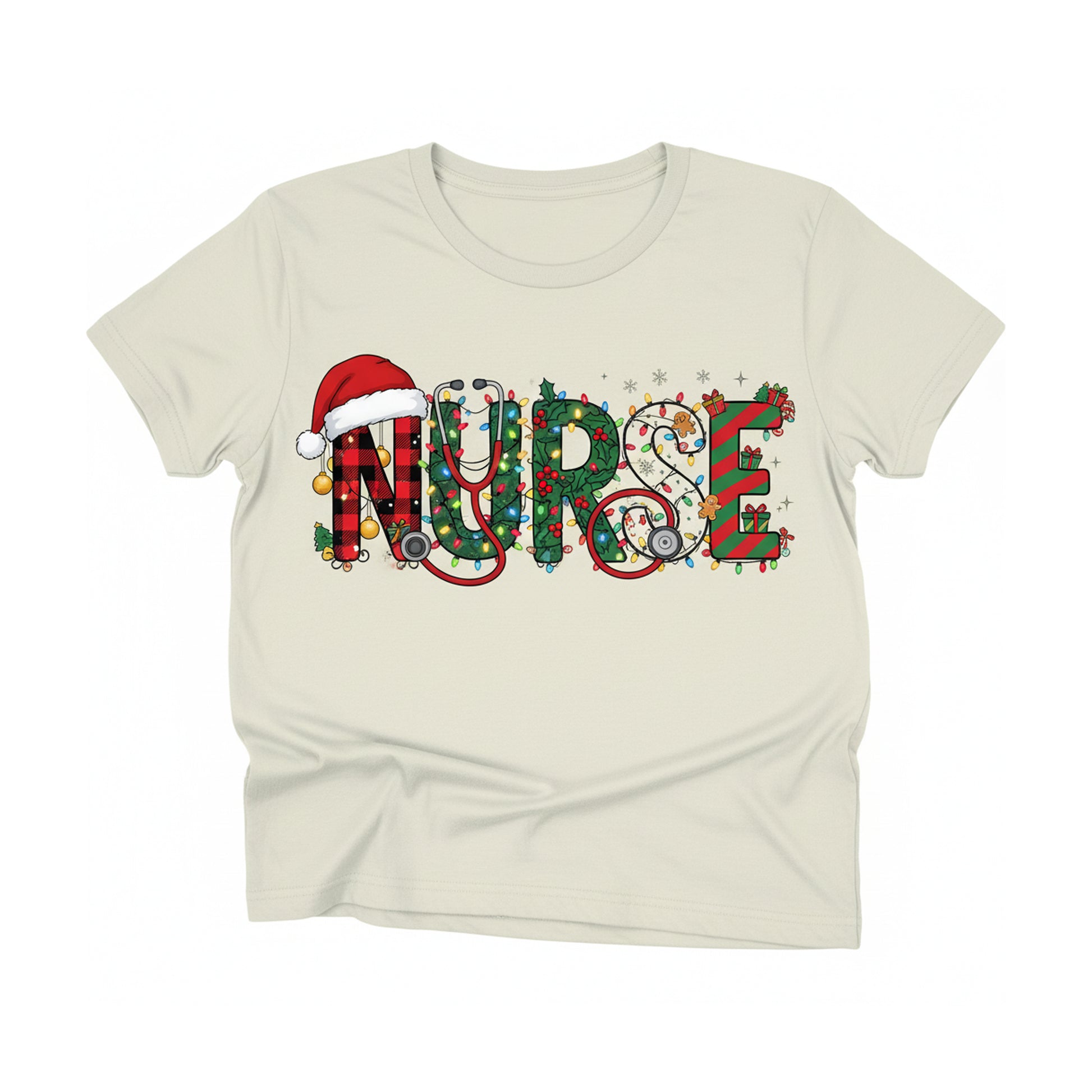 Celebrate your holiday spirit with this Funny Christmas Nurse T-Shirt — featuring festive lights, holly leaves, and a Santa hat on the word “NURSE.” It’s the perfect way for hardworking nurses to show their Christmas cheer while spreading smiles through every shift.