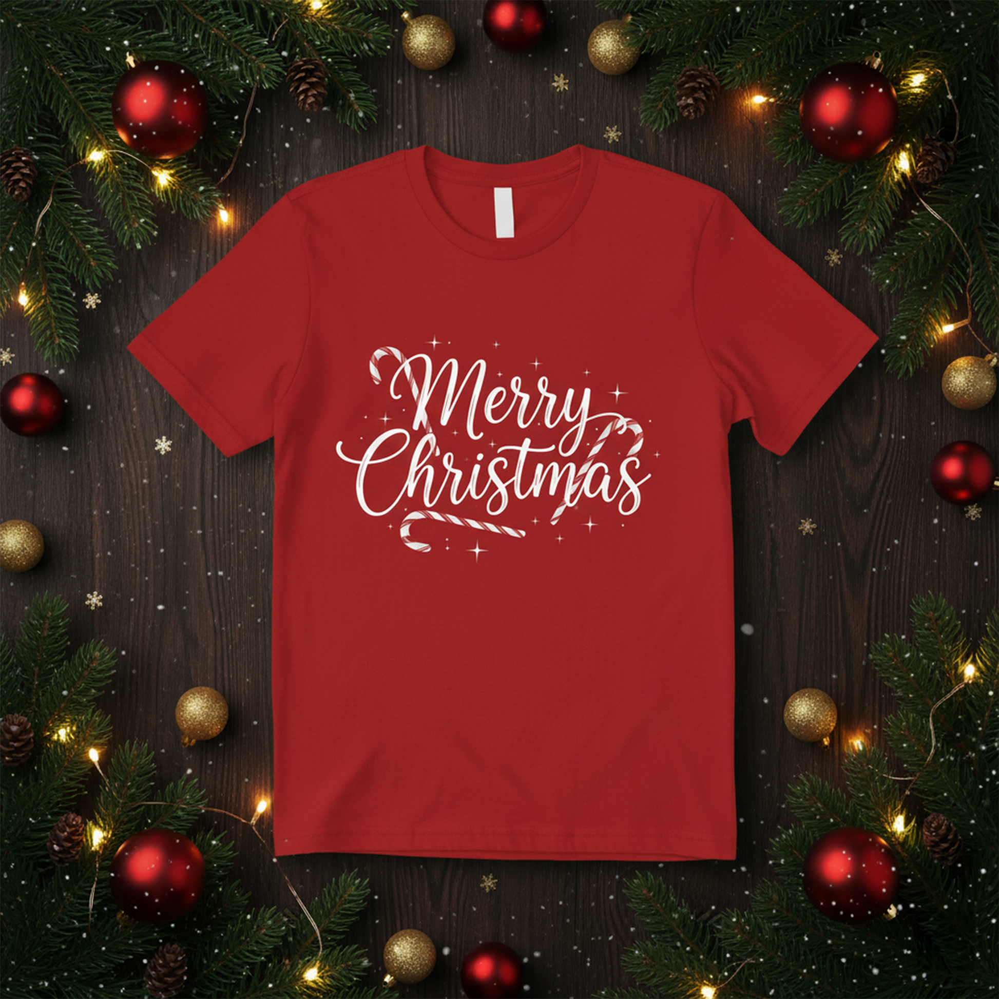 This festive tee features elegant “Merry Christmas” lettering wrapped in candy canes and sparkles — a timeless design that captures the joy of the holidays. Perfect for Christmas parties, family photos, or cozy winter days by the fireplace.