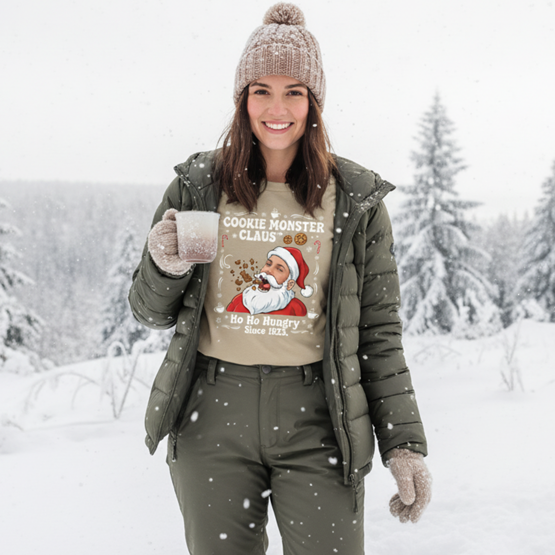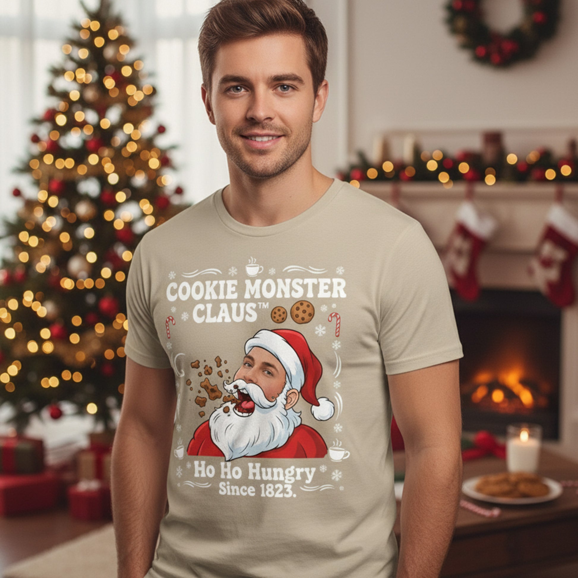 🎅 Add some laughter to your Christmas! Upload your photo and get your Cookie Monster Claus™ Custom T-Shirt – Ho Ho Hungry Since 1823 today!