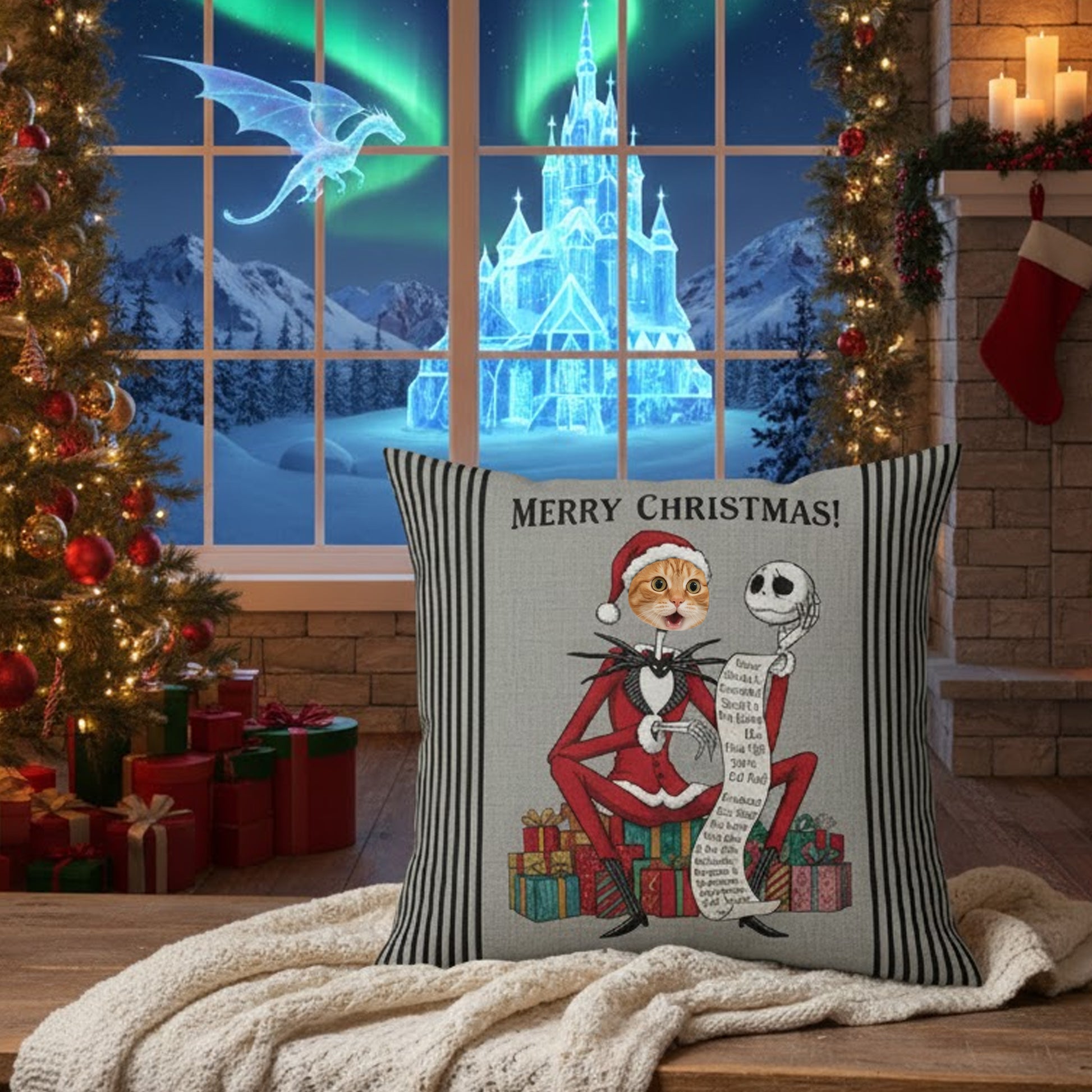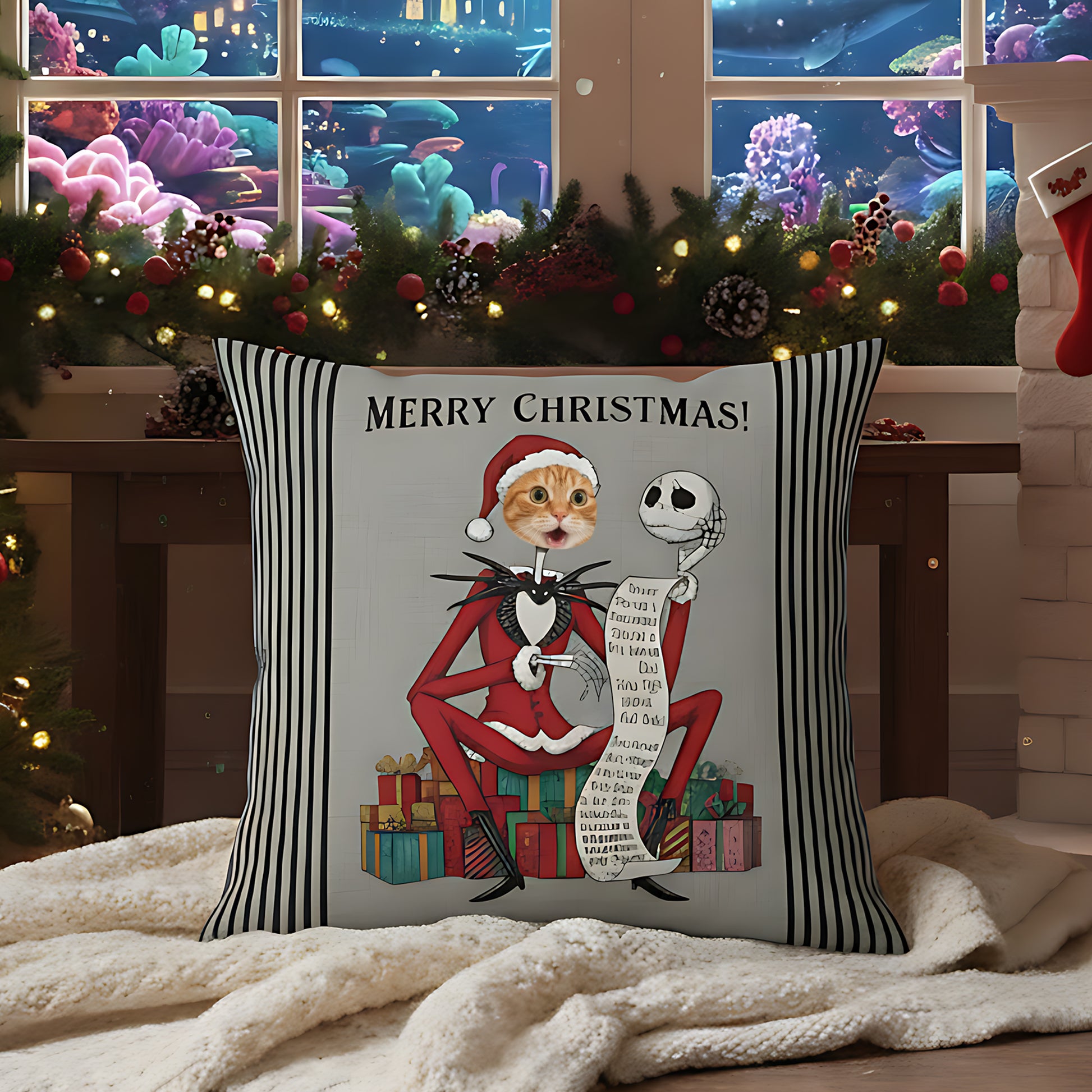 This pillow features your custom photo and name with a mischievous Christmas scene where a cat joins forces with a skeleton in a holiday-style collaboration. Add your pet’s adorable face or your own to make this pillow extra personal! It’s the perfect way to combine the magic of Christmas with a touch of the unexpected.