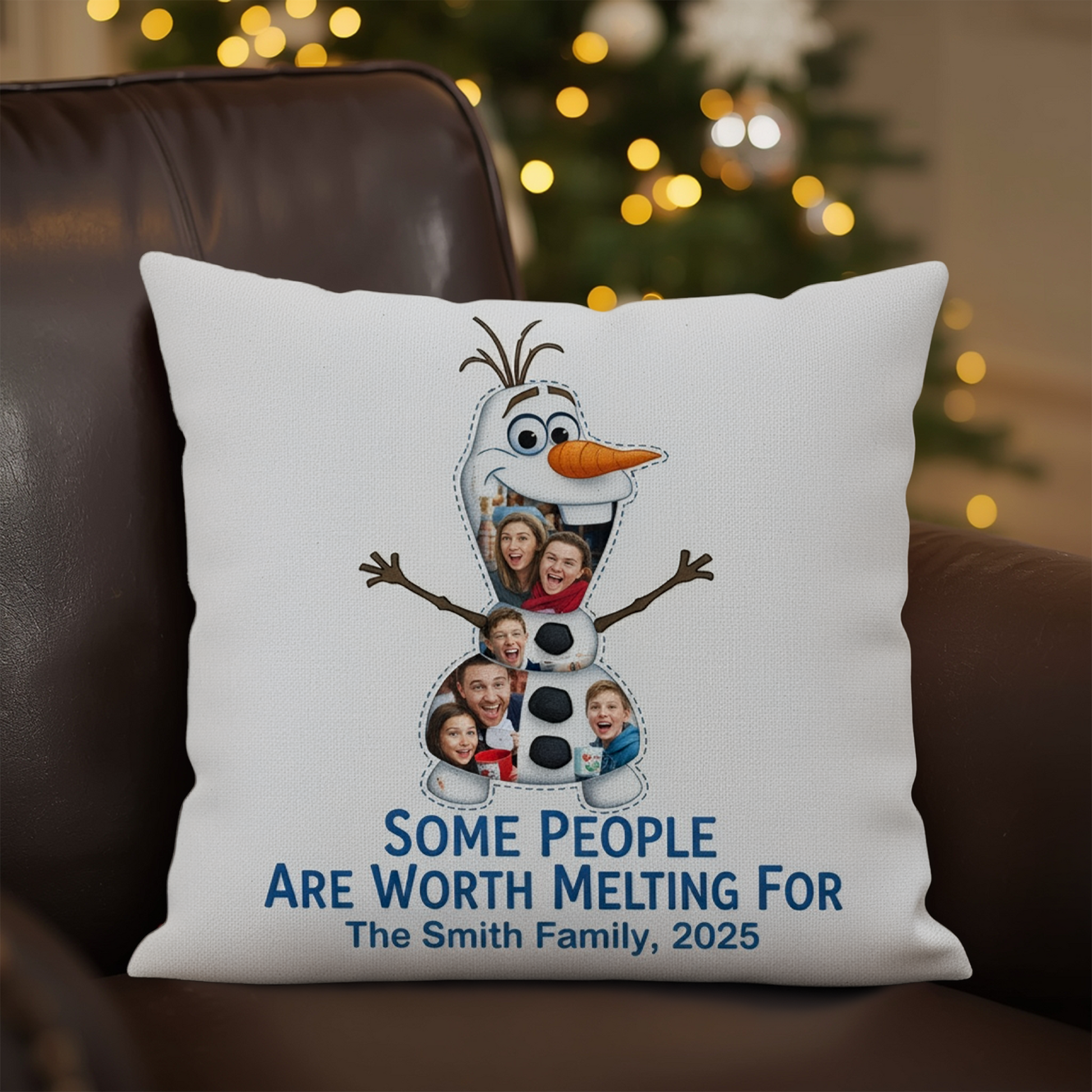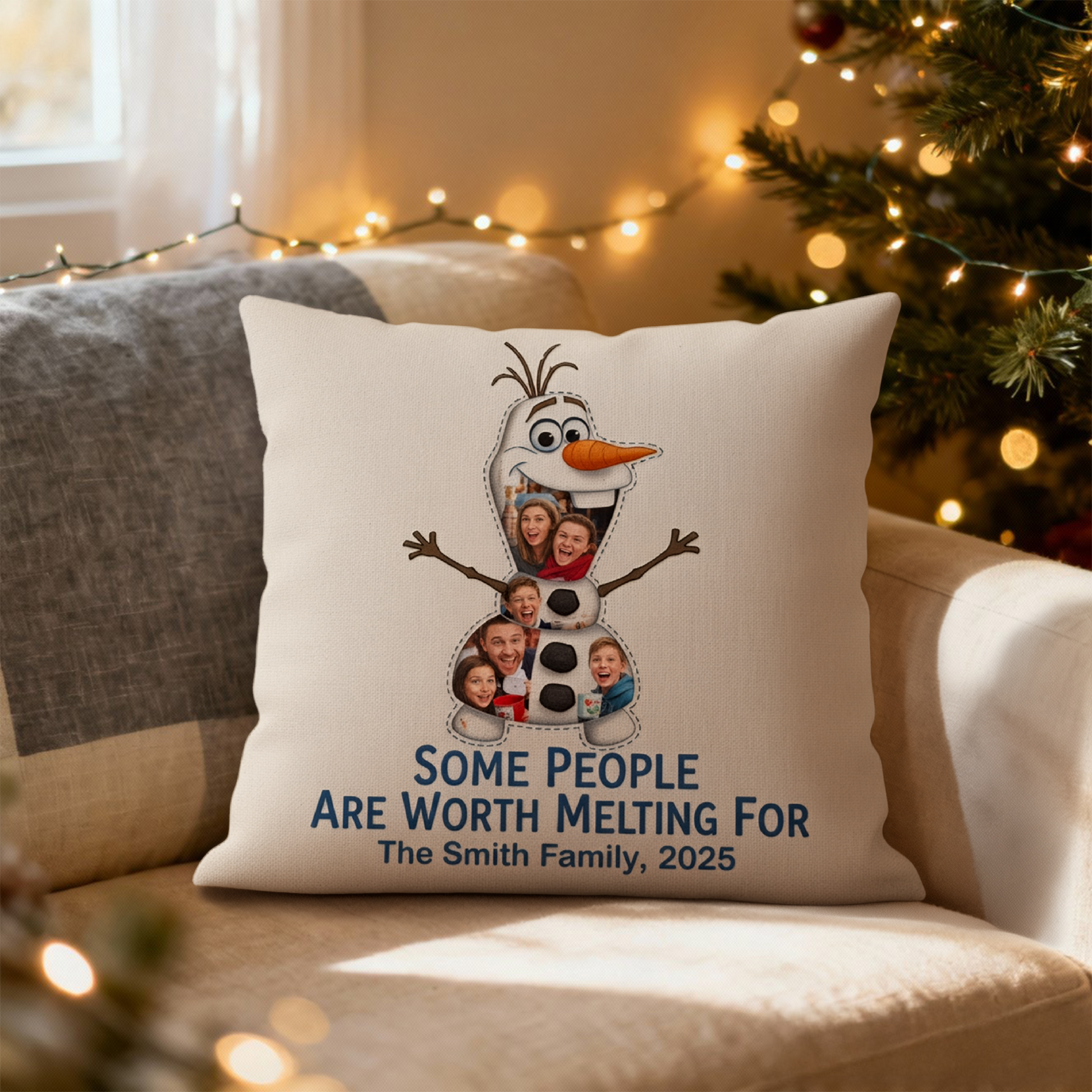 Custom Family Snowman Pillow, Personalized Linen Cushion with Photo & Name, Warm Winter Decor, Christmas Gift for Loved Ones | Pillow 100