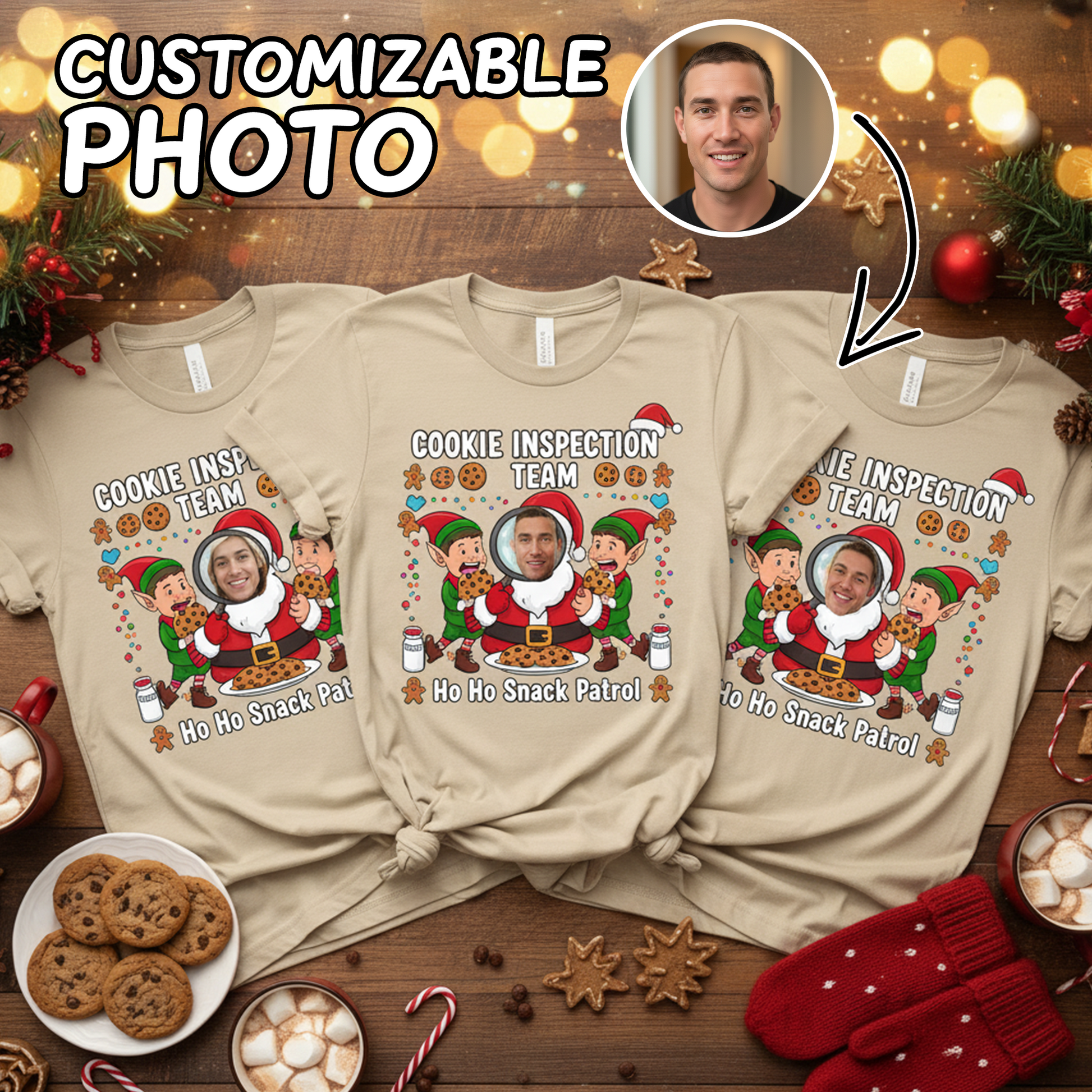 Custom Photo Cookie Inspection Team Christmas T-Shirt, Funny Santa Elf Tee, Personalized Holiday Family Shirt, Xmas Gift for Friends | T-shirt 17