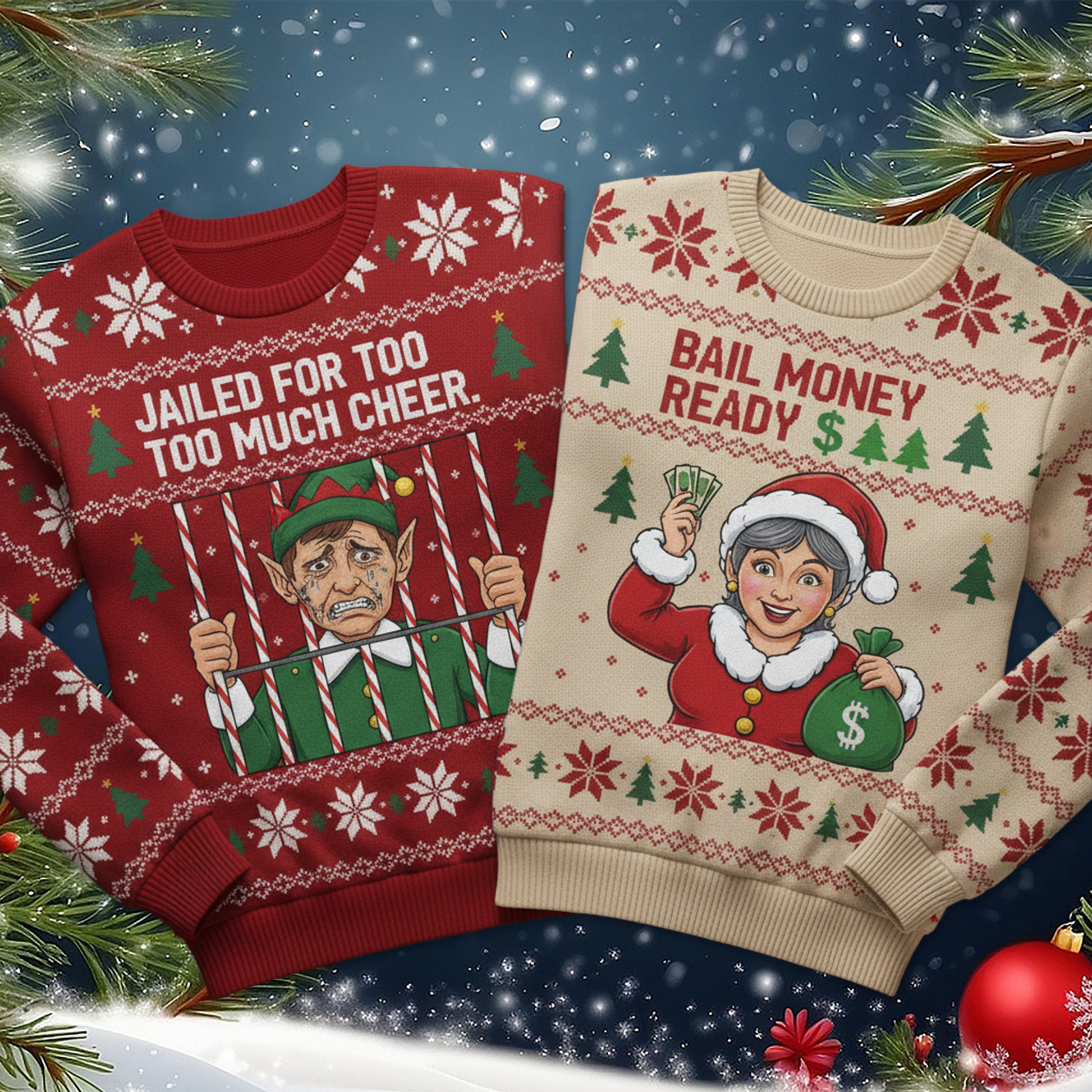 Click Add to Cart to customize your “Jailed for Too Much Cheer” or “Bail Money Ready” sweater today — because someone’s gotta bail out Christmas! 💸🎄