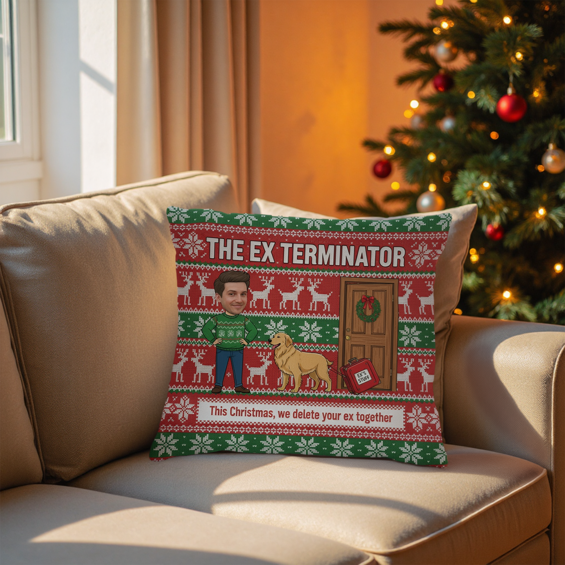 Custom Photo Funny Christmas Pillow – The Ex Terminator – Personalized Gift for Dog Lovers – Hilarious Holiday Cushion for Friends| Pillow 88