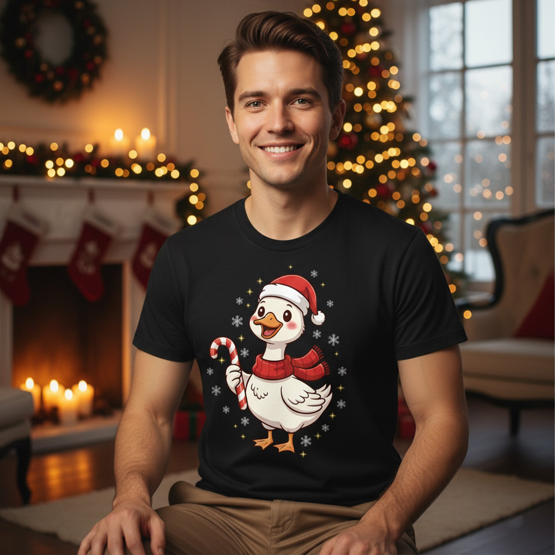 This adorable tee features a cheerful goose wearing a Santa hat and scarf, holding a candy cane surrounded by snowflakes. A perfect mix of cozy Christmas charm and fun animal spirit, it’s ideal for anyone who loves unique and festive designs.