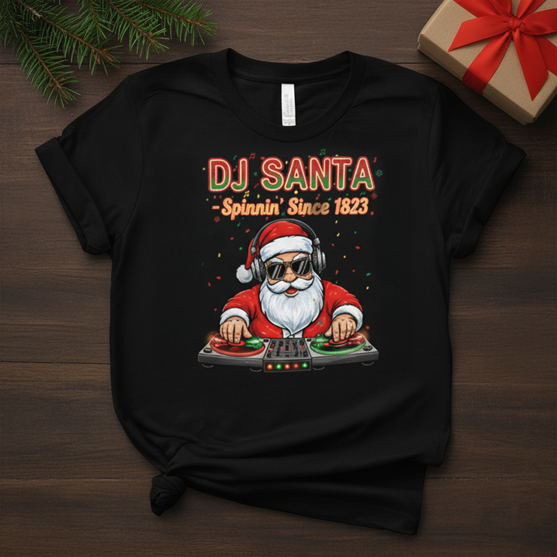 Turn up the holiday beats with our DJ Santa Christmas T-Shirt! 🎅