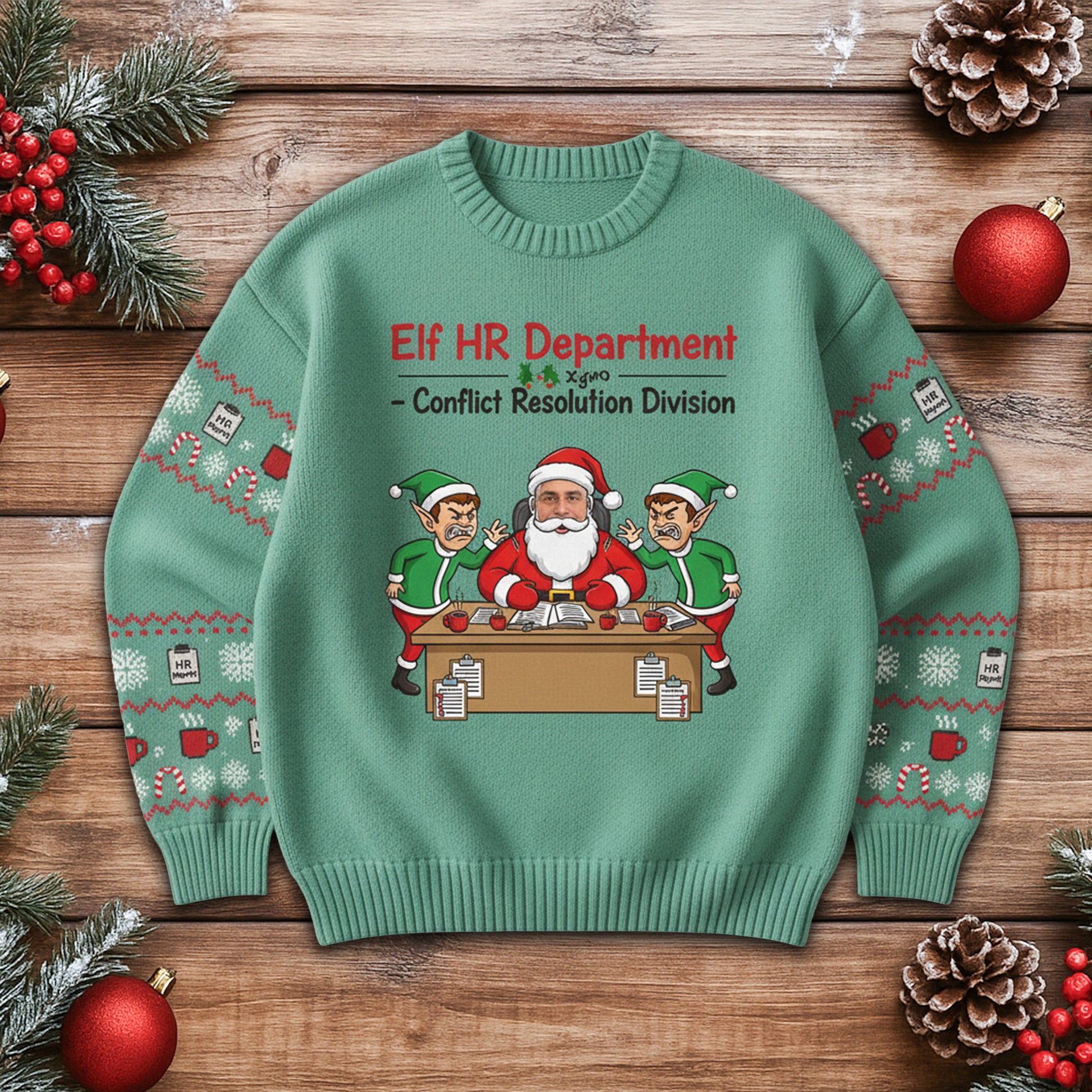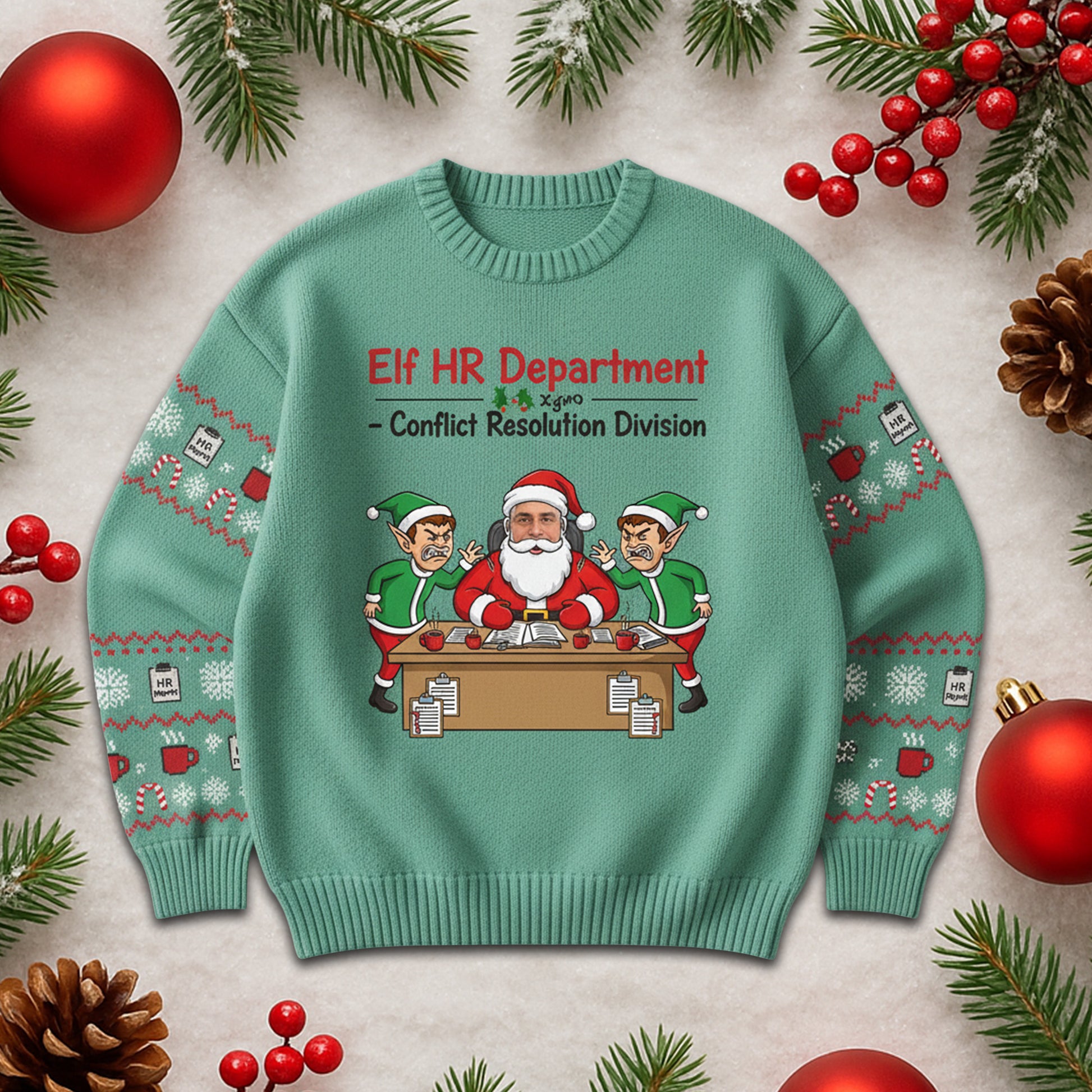 This Christmas, Santa is on the job and working overtime in the Elf HR Department with the Conflict Resolution Division! Featuring Santa trying to mediate a dispute between two elves, this hilarious sweater reads "Elf HR Department – Conflict Resolution Division". It's the perfect mix of holiday humor and HR chaos for those who love a good laugh during the festive season.