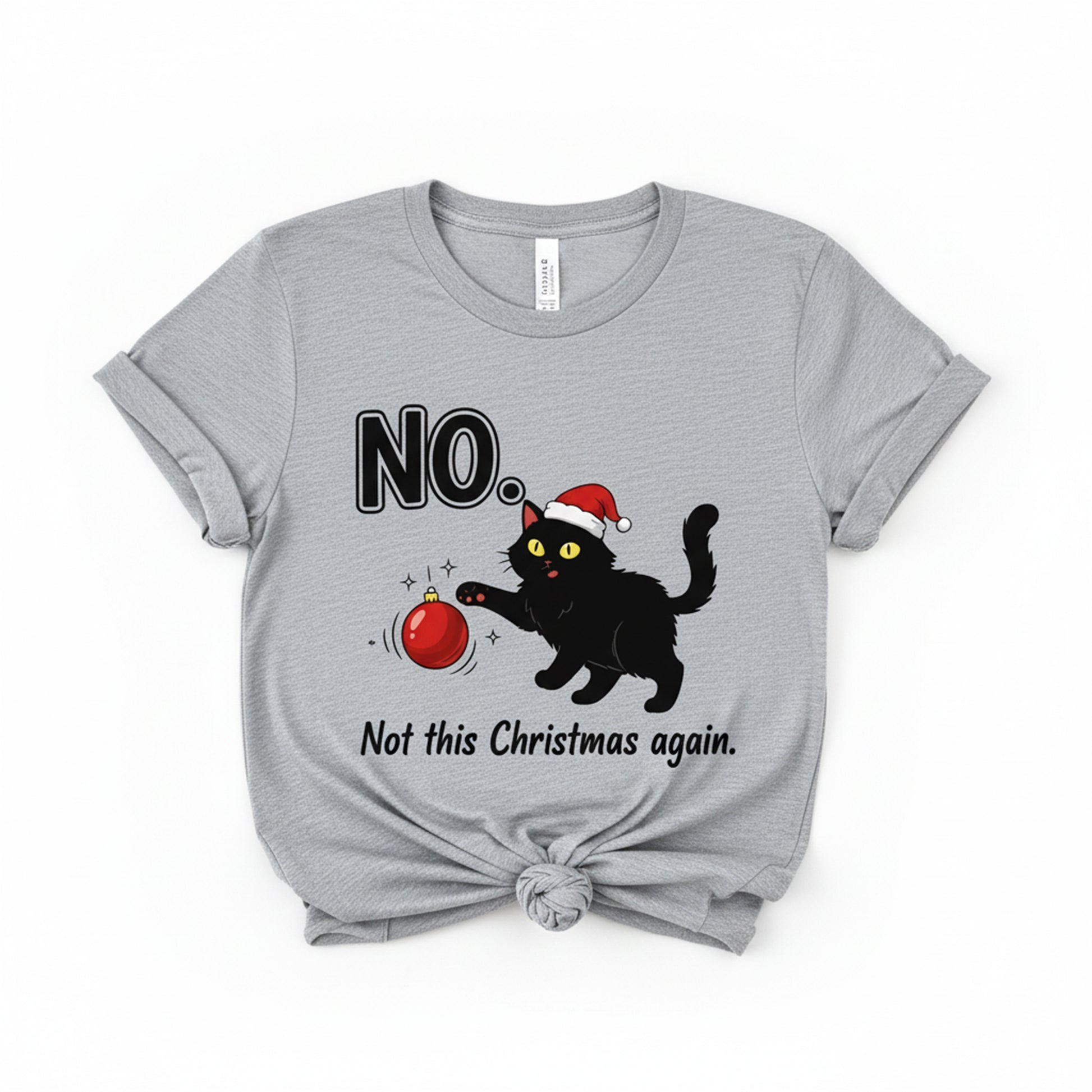 Design: Black cat in a Santa hat playfully swatting a Christmas ornament with the quote “No. Not this Christmas again.”