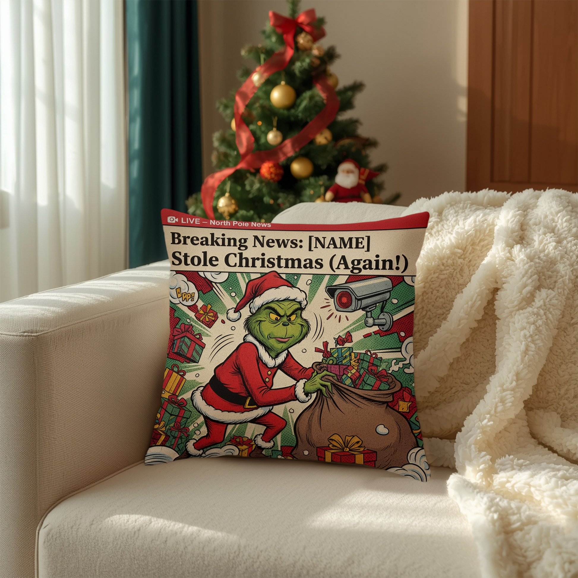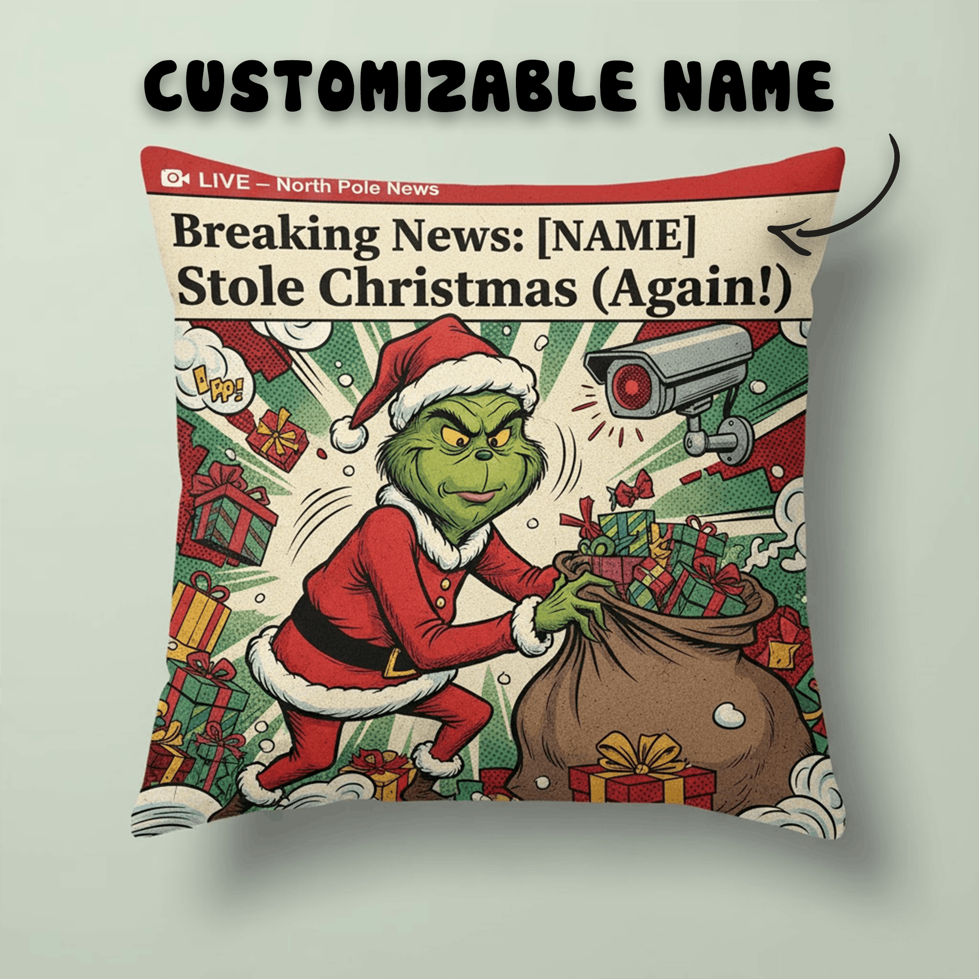 This Funny Breaking News Custom Pillow lets you add your own name to the headline — turning your living room into a front-page story of holiday mischief.