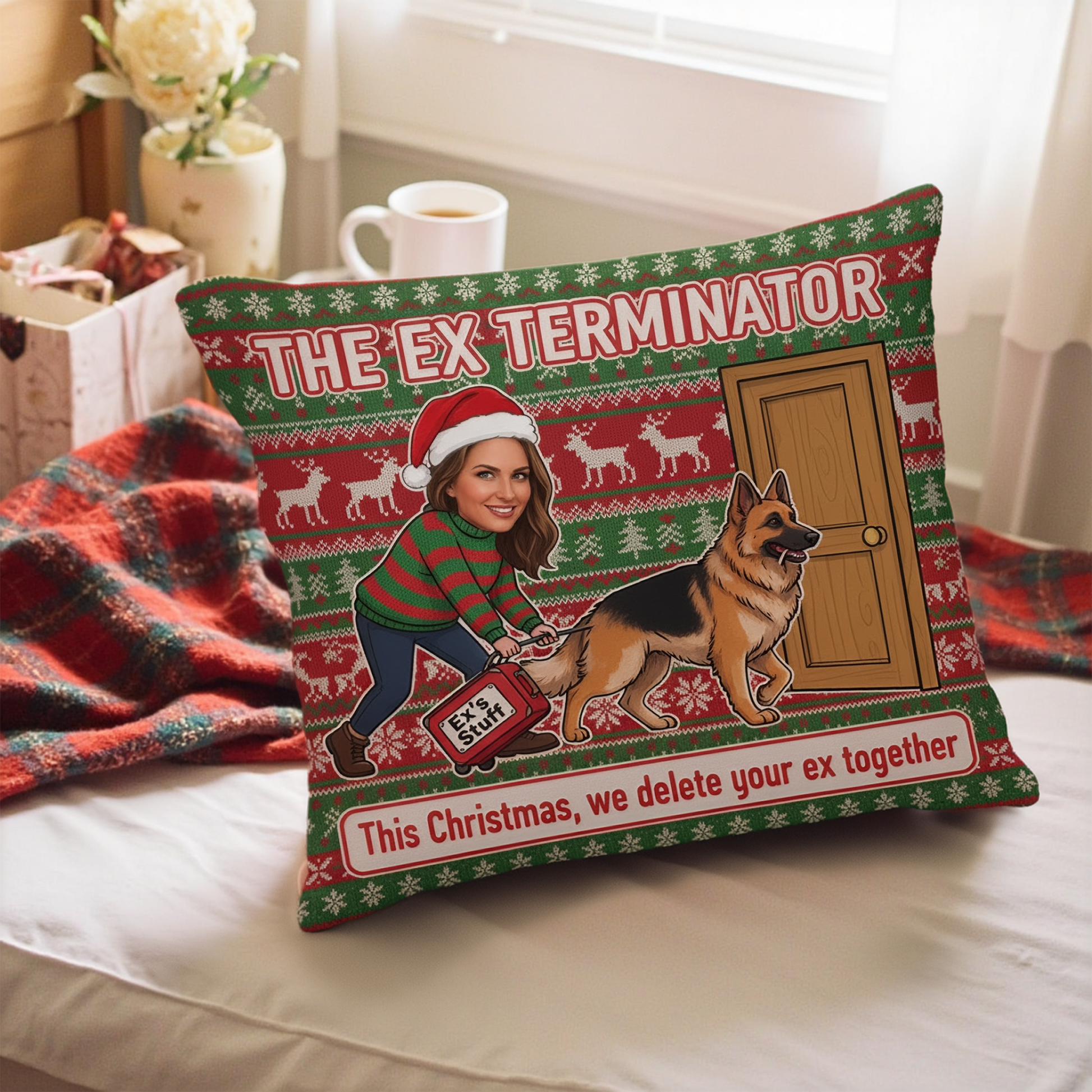 This Christmas, team up with your furry partner-in-crime and become The Ex Terminator — the festive, funny, and slightly savage custom pillow design that’s guaranteed to bring laughs (and closure).