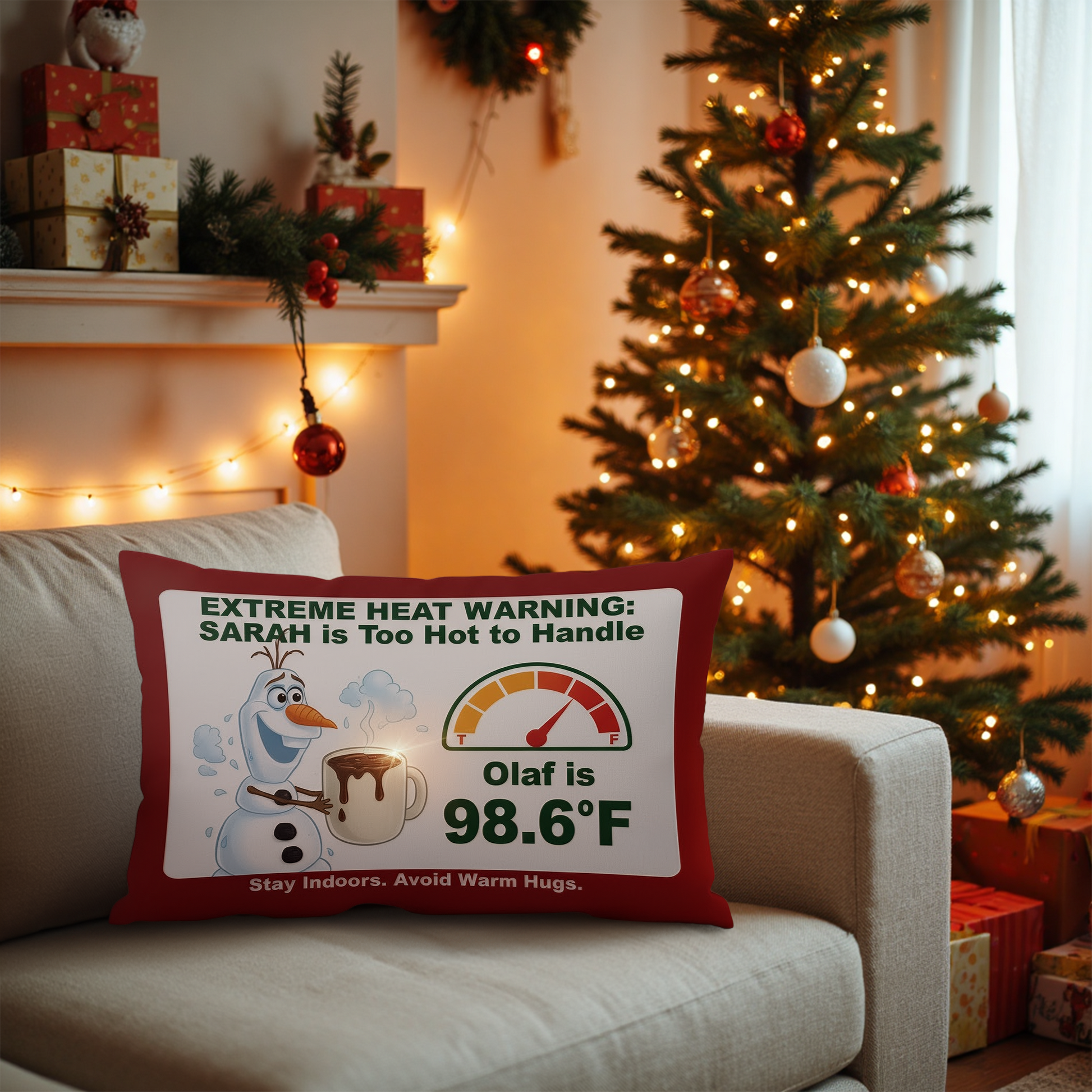 Funny Custom Name Pillow – Extreme Heat Warning, Too Hot to Handle Olaf Design, Personalized Christmas Gift, Cute Winter Decor | Pillow 108