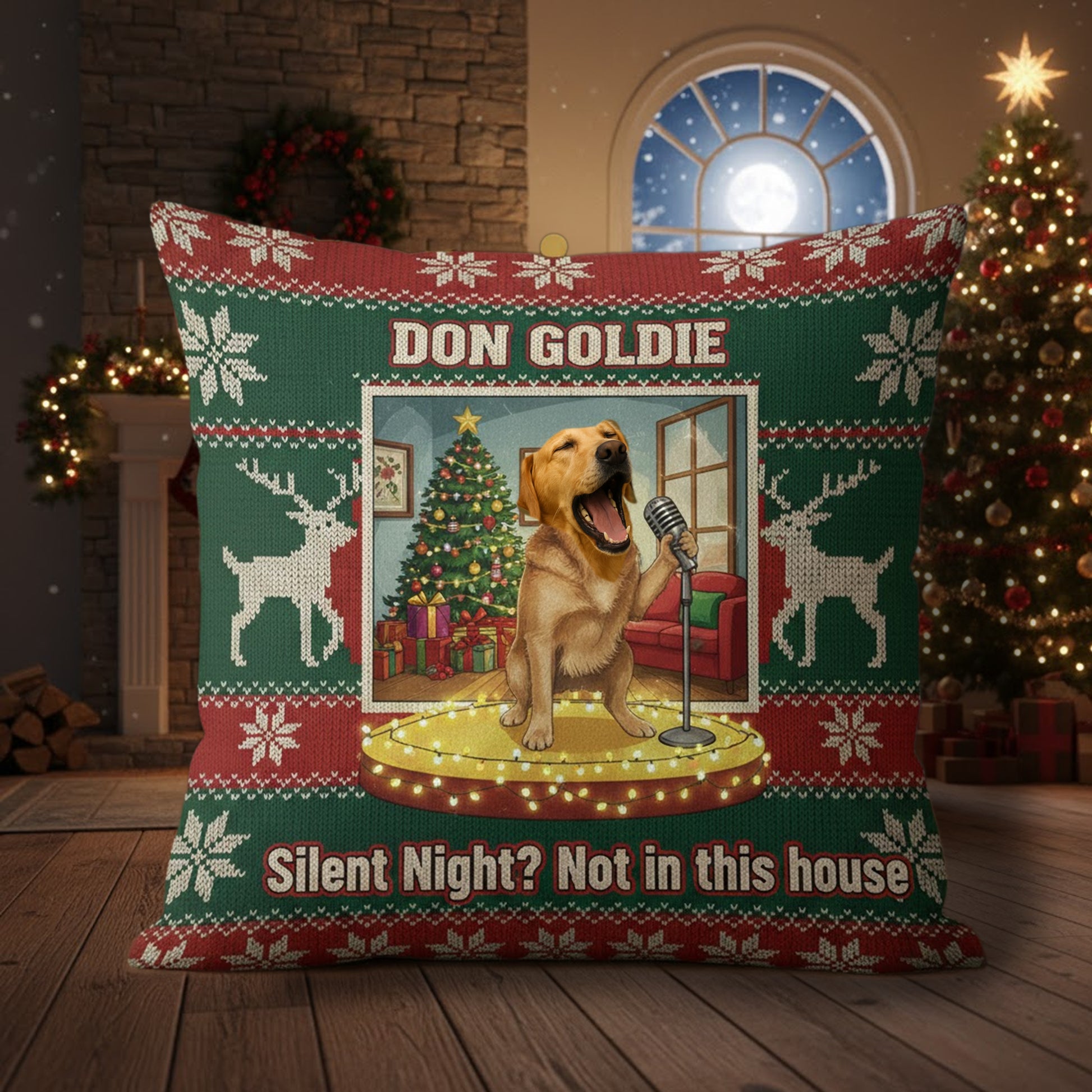 “Silent Night? Not in This House” – the bright yellow dog sings enthusiastically next to the sparkling Christmas tree.