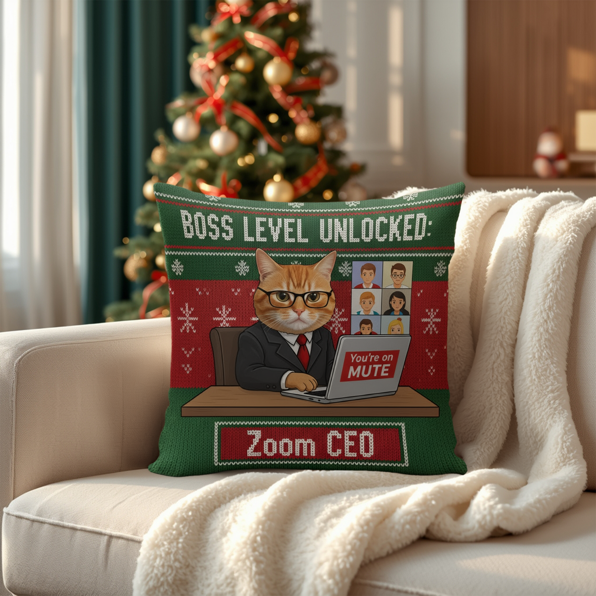 Funny Pet Christmas Pillow – Boss Level Unlocked: Zoom CEO – Cat Office Humor Cushion – Gift for Coworkers, Pet Lovers| Pillow 95