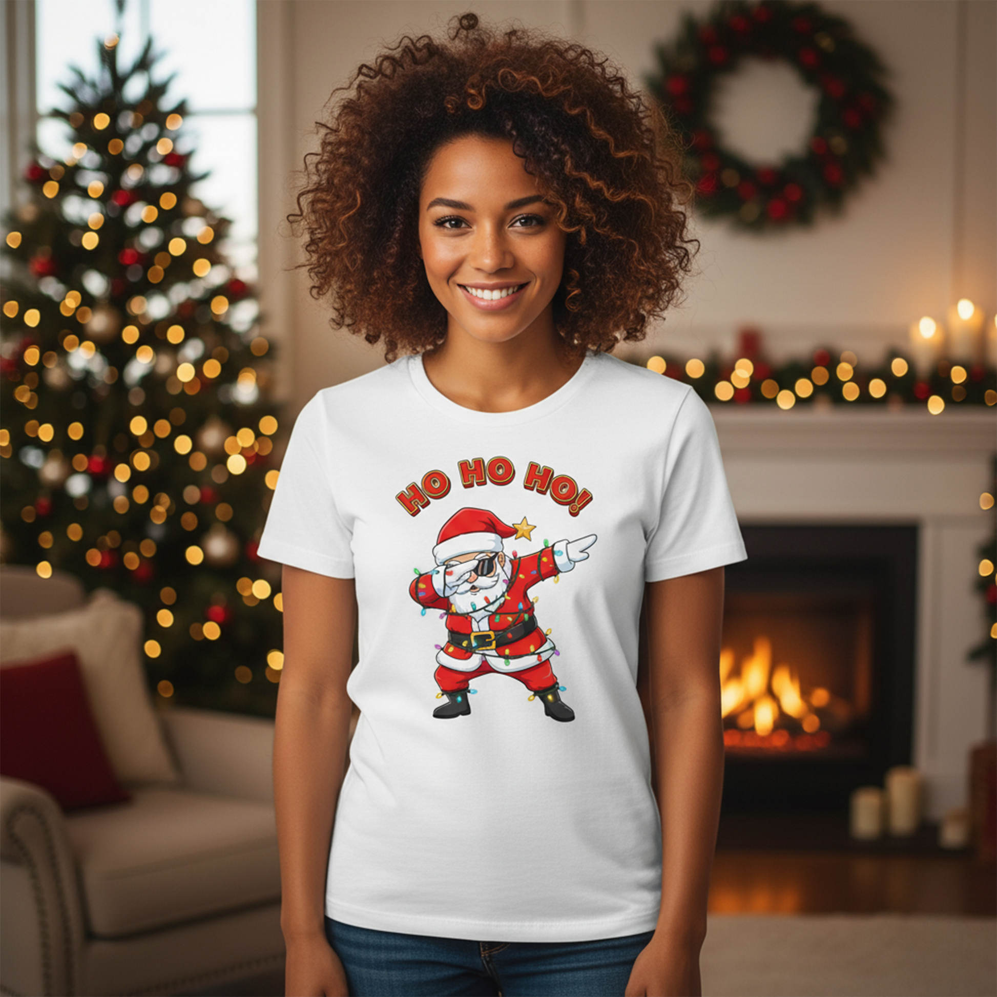 Add some humor and festive fun to your wardrobe with this Dabbing Santa “Ho Ho Ho” Christmas T-Shirt! 🎅
