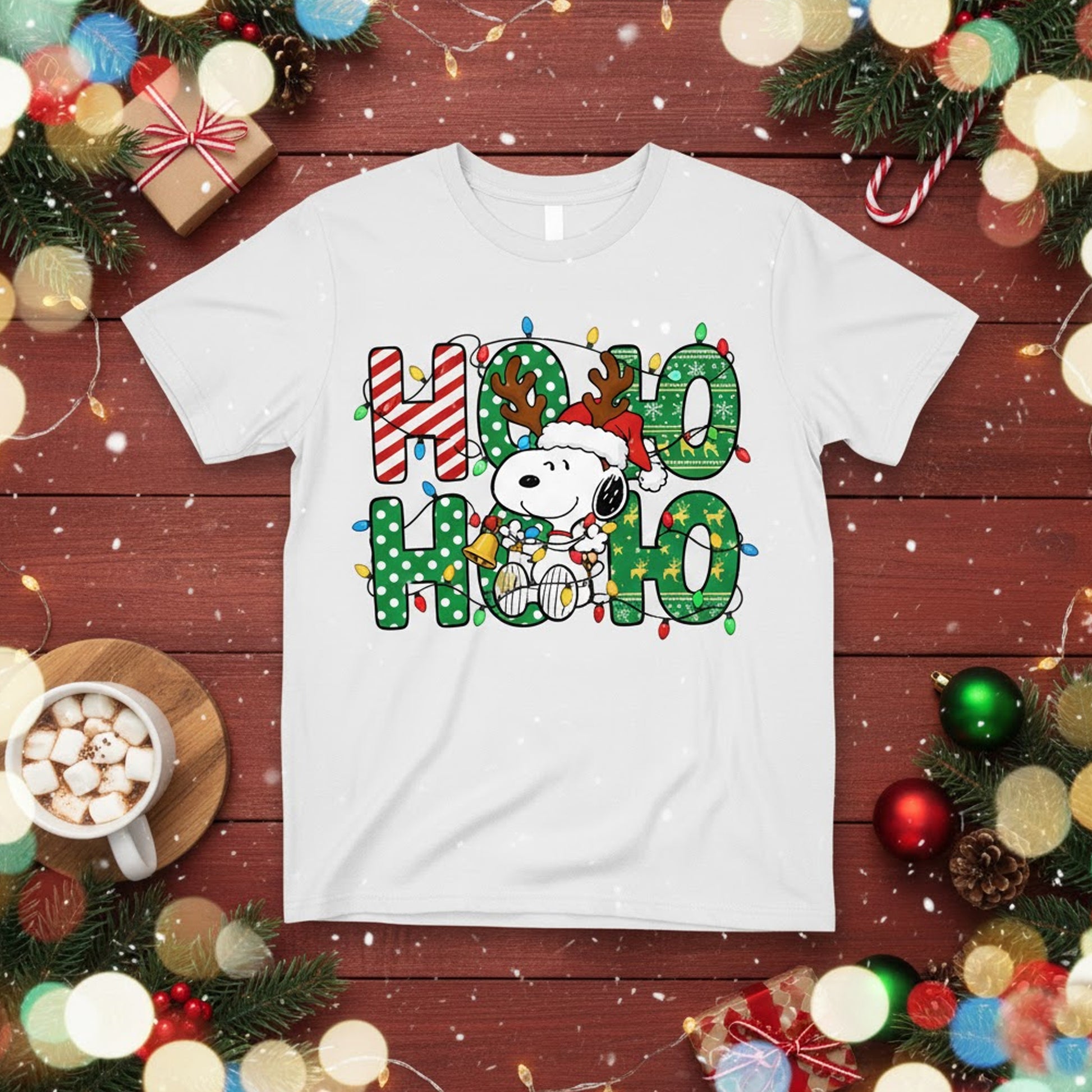 Featuring an adorable dog in reindeer antlers surrounded by candy canes and Christmas lights, this tee captures the playful spirit of Christmas perfectly.