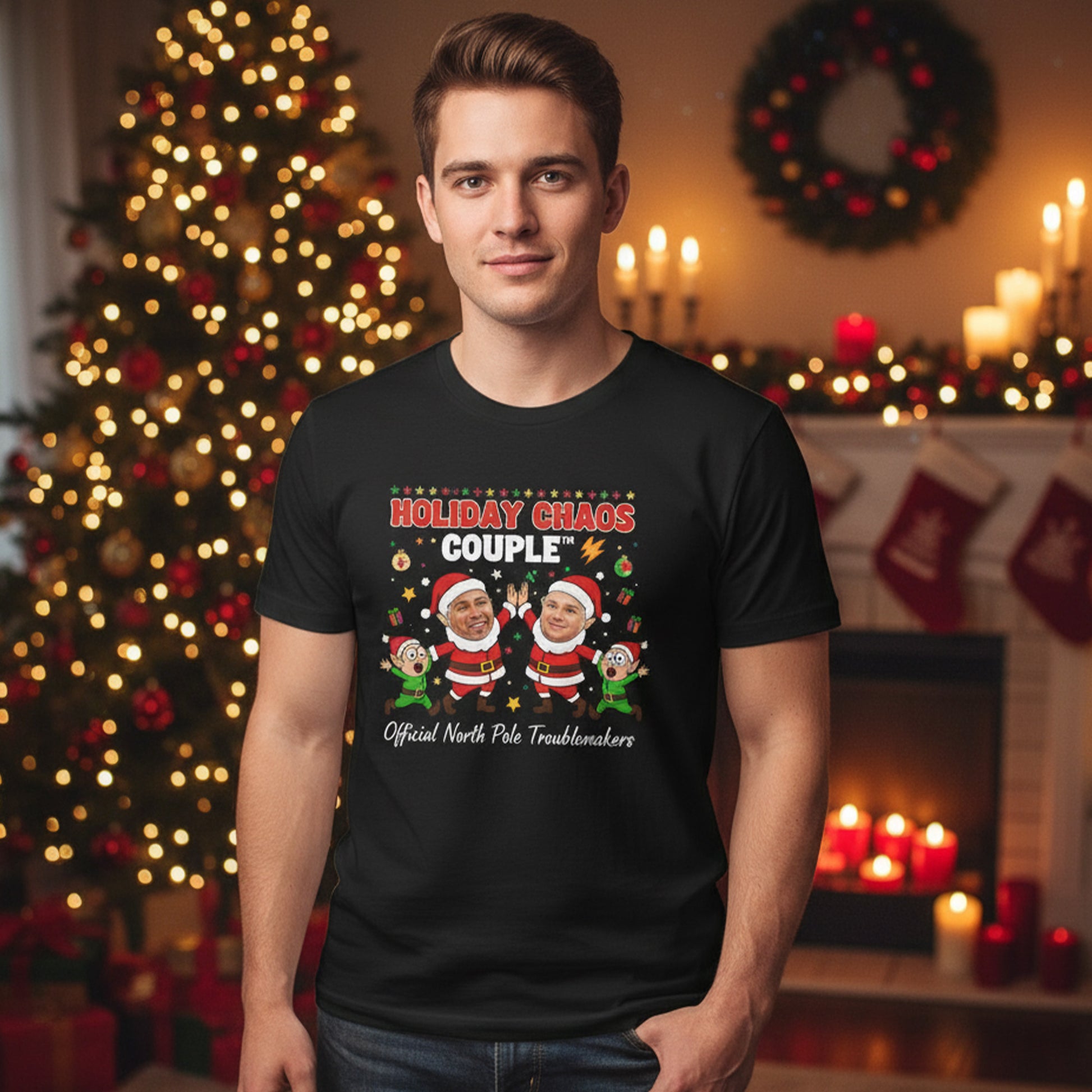 🎄 Embrace the chaos together! Upload your photos and get your Holiday Chaos Couple™ Custom Photo T-Shirt — because every great couple deserves a little festive mischief!
