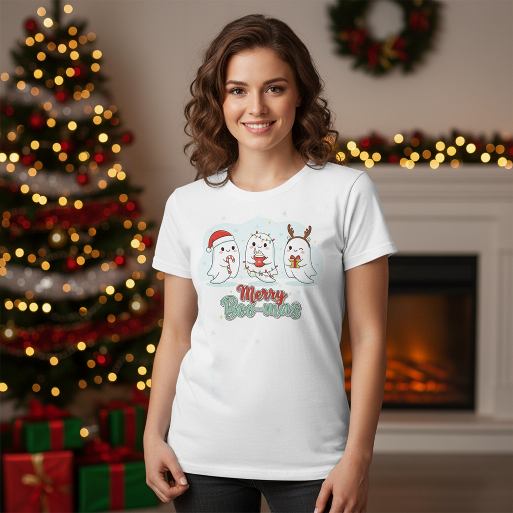 Get spooky and merry this season with our Merry Boo-mas Christmas Ghost T-Shirt! 👻🎅