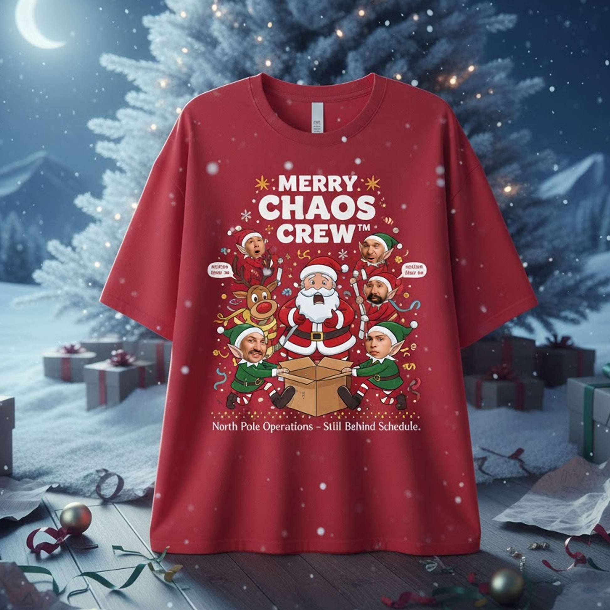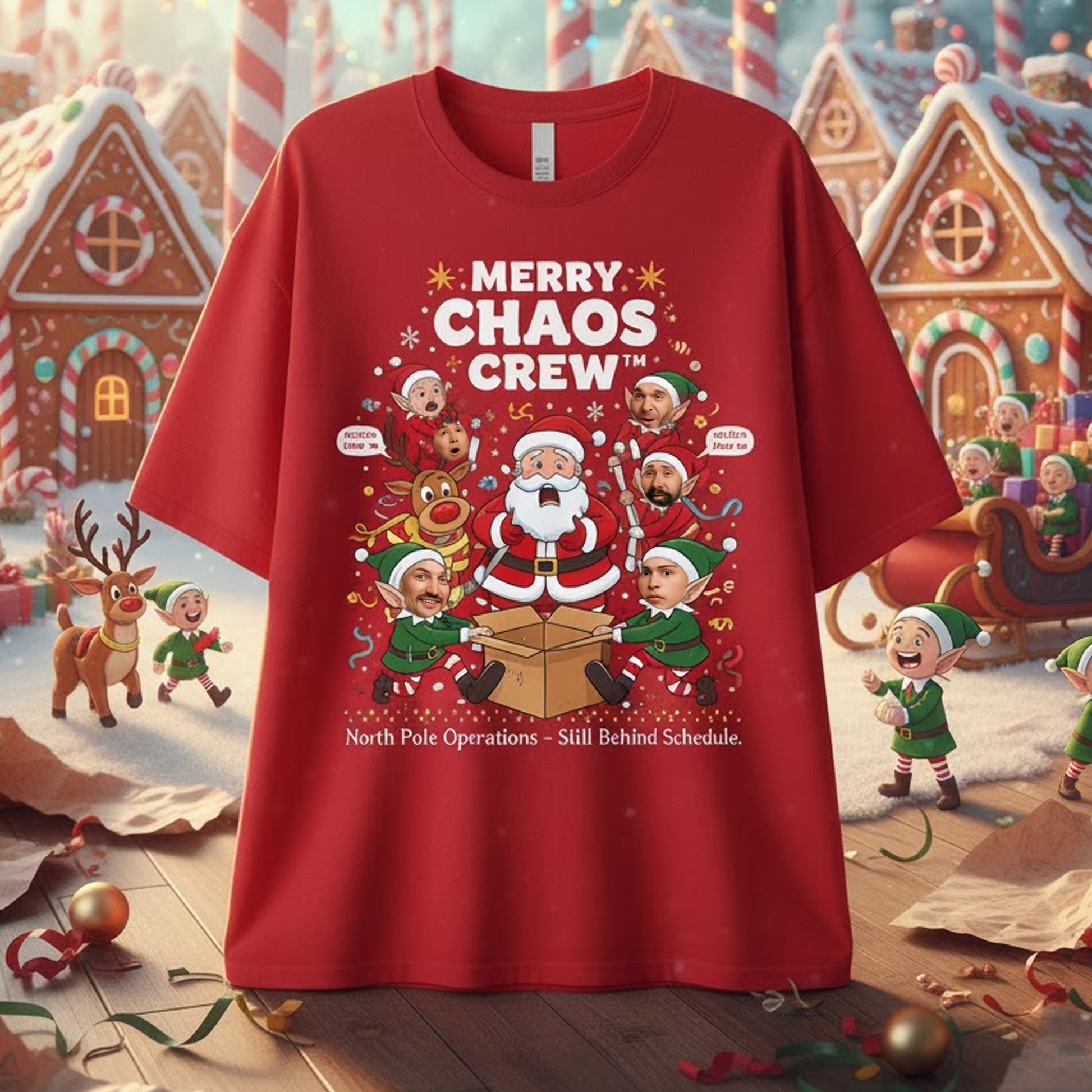 Design: “Merry Chaos Crew – North Pole Operations: Still Behind Schedule” with custom face photo slots