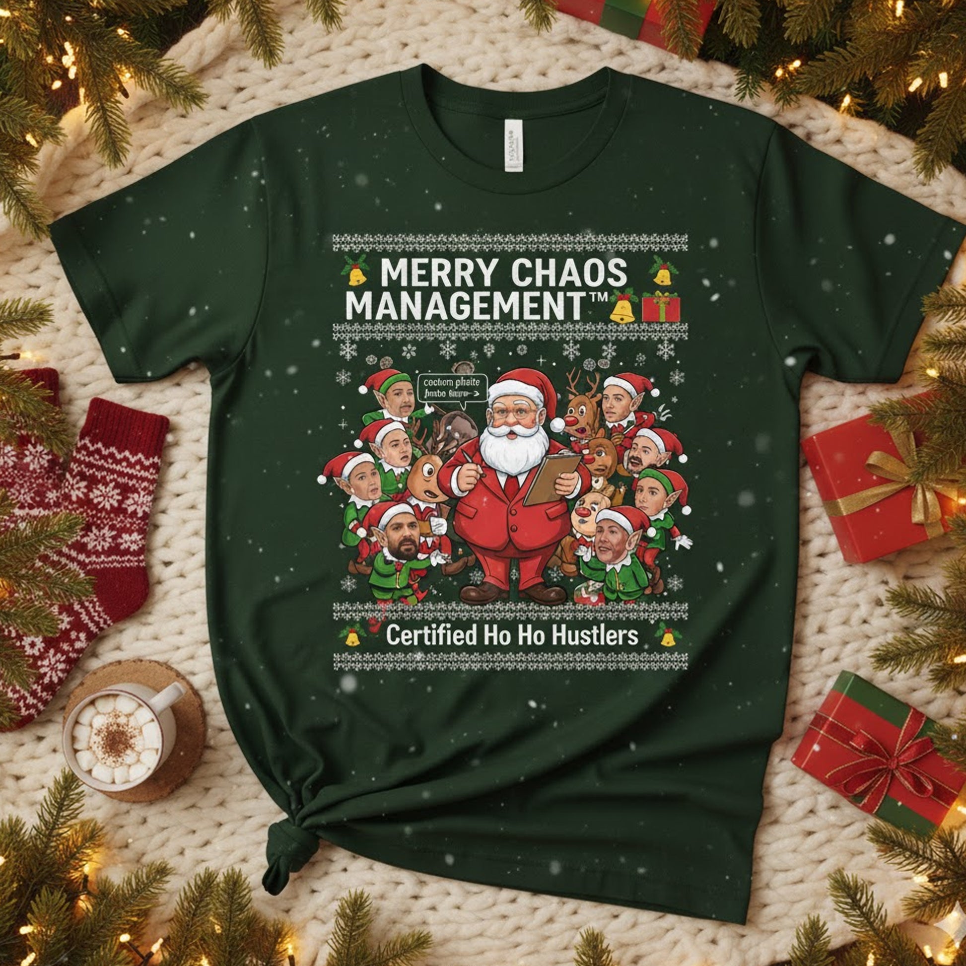 Celebrate the chaos of Christmas in style with our Merry Chaos Management™ Custom Photo T-Shirt – Certified Ho Ho Hustlers! 🎅✨