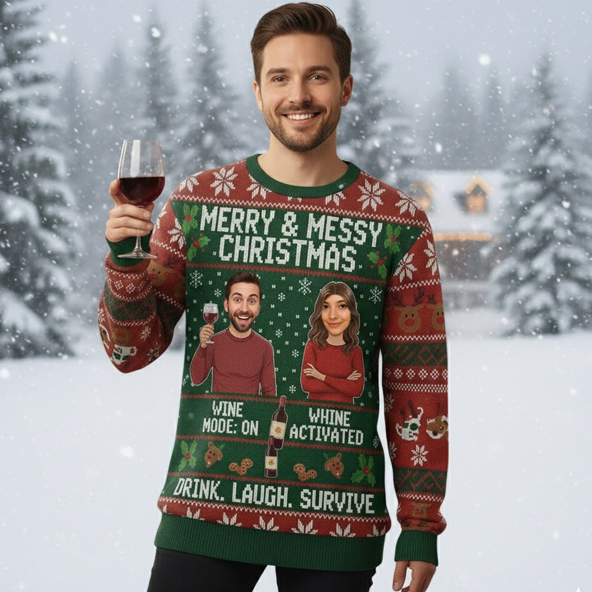 Merry & Messy Ugly Christmas Sweater – Customizable Photo, Funny Holiday Jumper, Wine Mode On, Whine Activated | Ugly 55