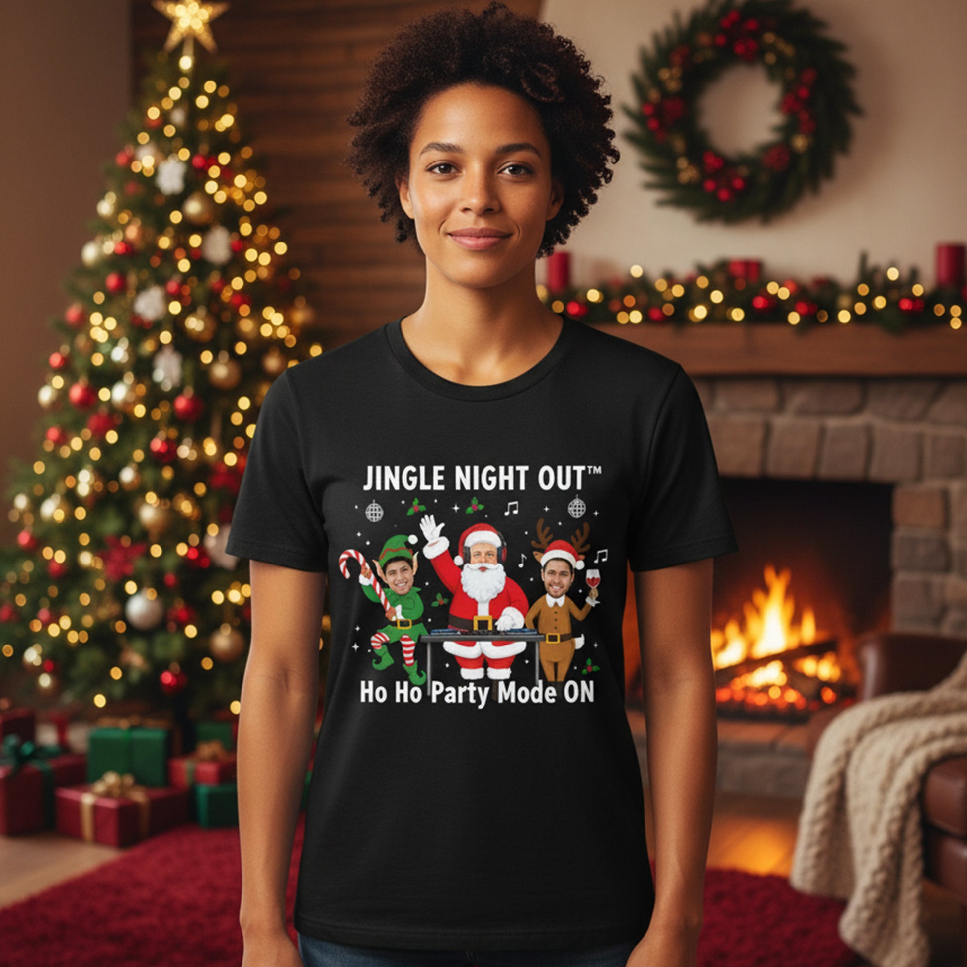 Design: “Jingle Night Out™ – Ho Ho Party Mode ON” with your custom faces printed as Santa, Elf, and Reindeer