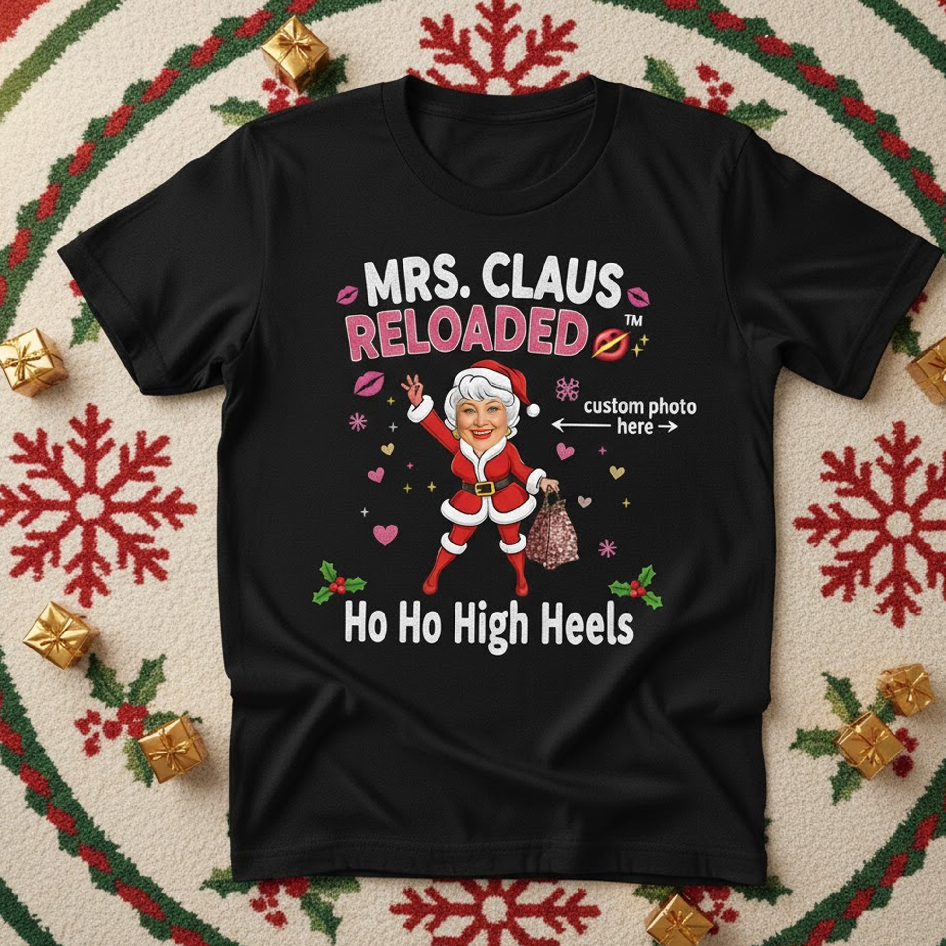👠 Step into Christmas with confidence! Upload your photo now and create your Mrs. Claus Reloaded™ Custom Photo T-Shirt today!