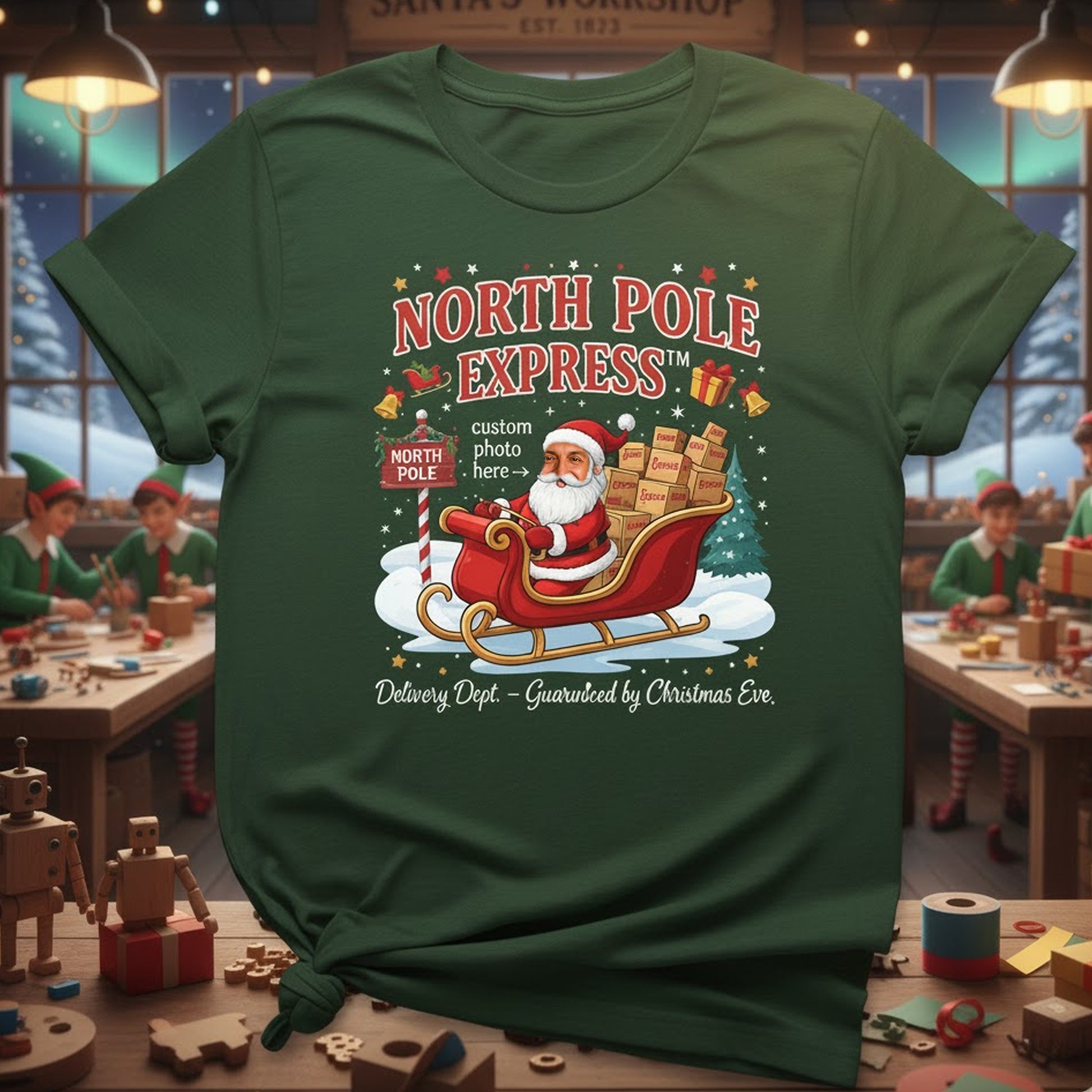 Design: “North Pole Express – Delivery Dept: Guaranteed by Christmas Eve” with your custom photo on Santa’s face