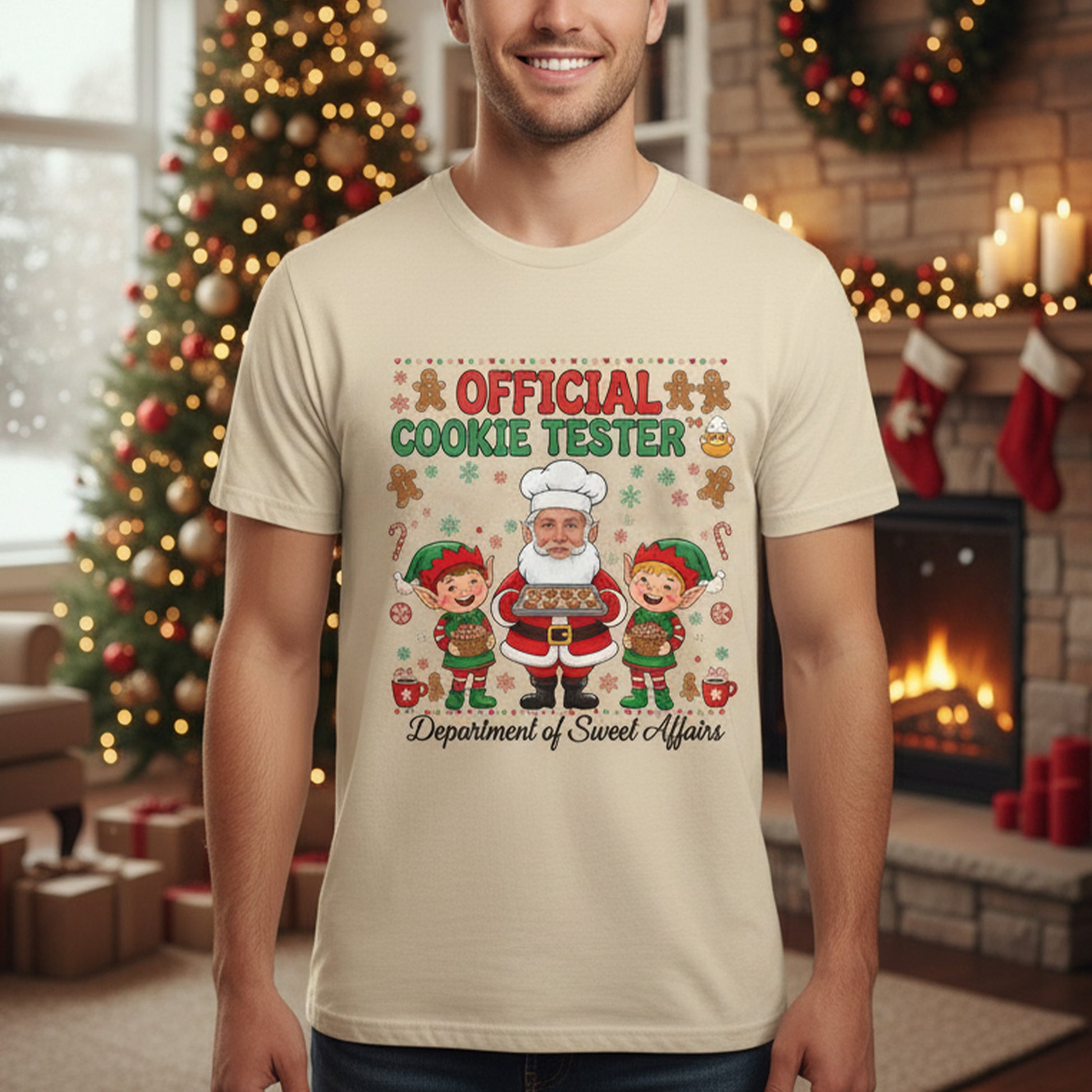 🎅 Bake up some holiday laughter! Upload your photo and order your Official Cookie Tester™ Custom Photo T-Shirt – Department of Sweet Affairs today!