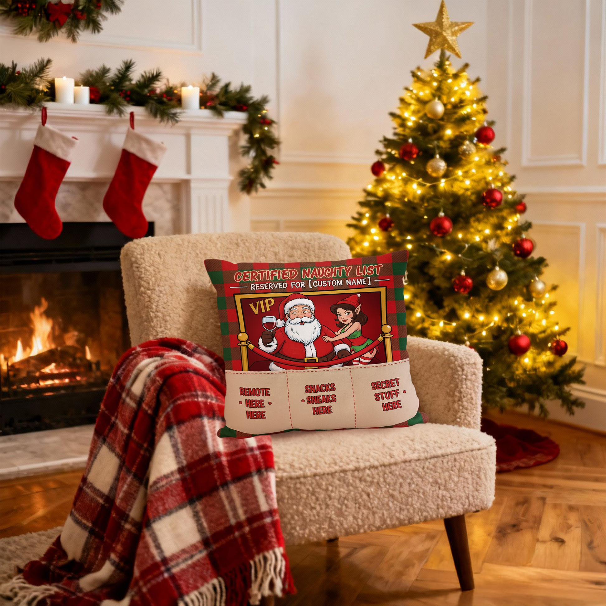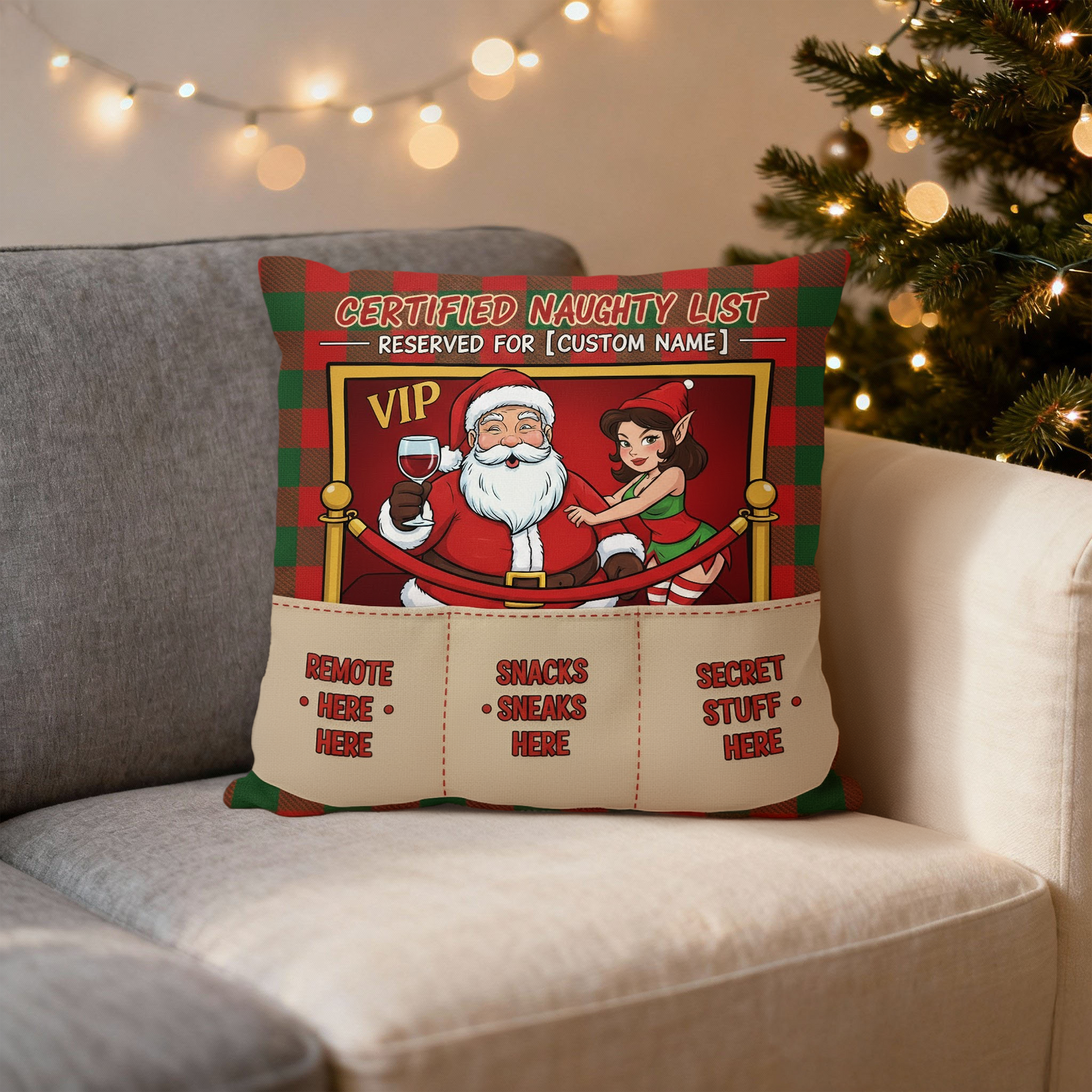 Personalized Christmas Naughty List Pillow with Pockets | Custom Name & Photo | Funny Santa Gift for Adults | Couch Snack & Remote Holder | Pillow 113