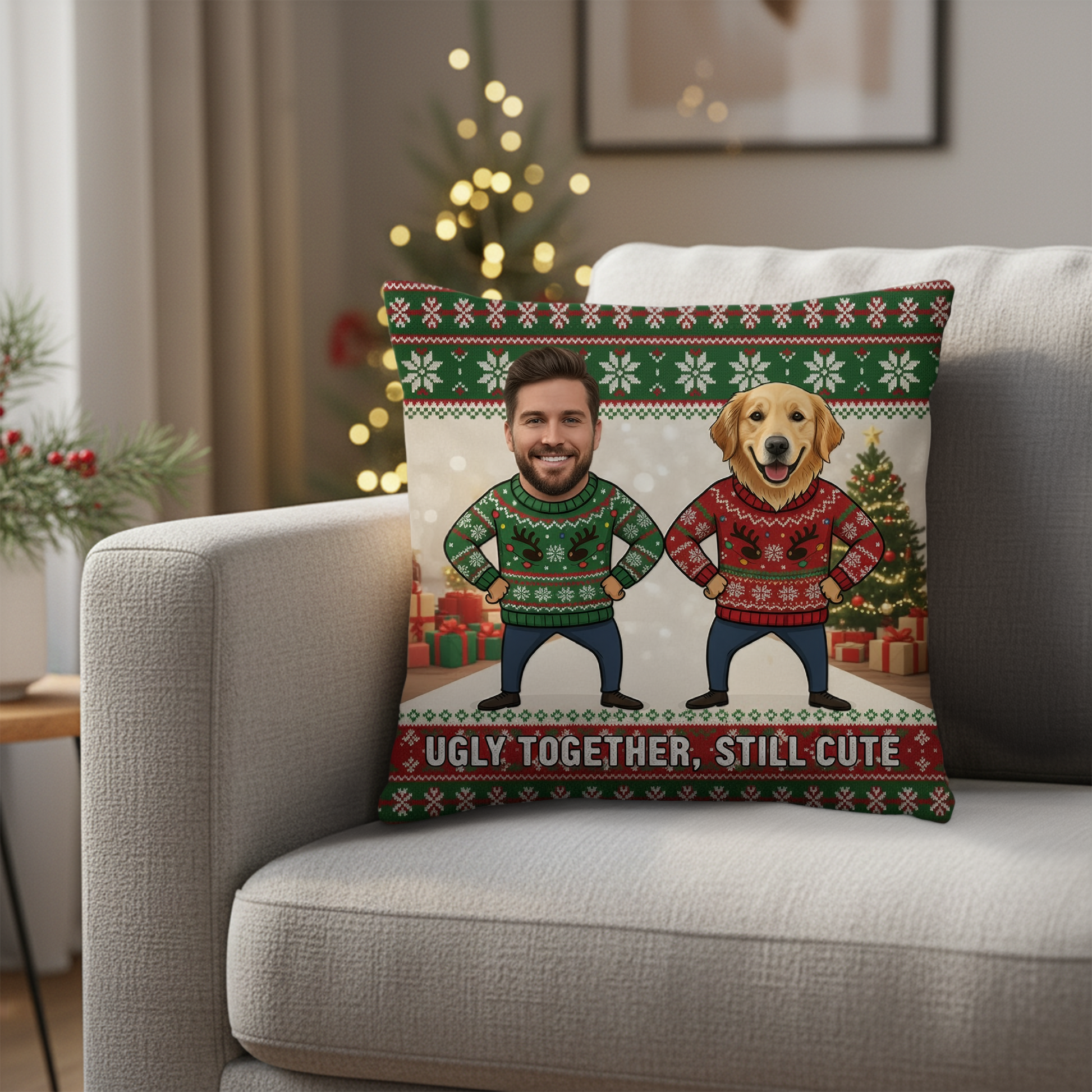 Celebrate this holiday season with laughter, warmth, and love — our “Ugly Together, Still Cute” Personalized Christmas Pillow lets you and your pet become the stars of your living room! Upload your photo and your pet’s photo, and we’ll turn them into a hilarious Christmas cartoon duo wearing matching ugly sweaters.
