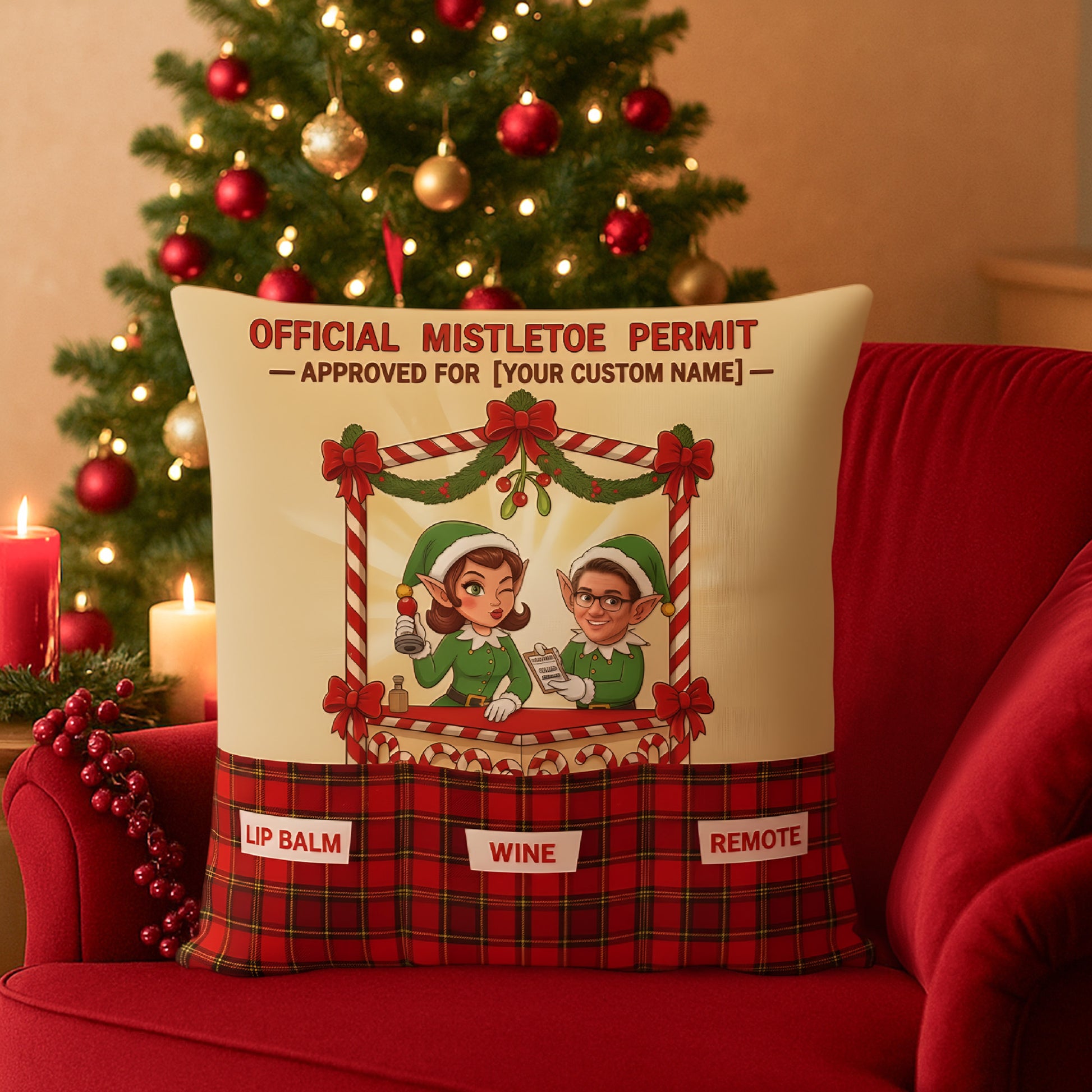 Our Personalized “Official Mistletoe Permit” Double-Sided Pillow is the sweetest holiday keepsake — perfect for couples who love to share a little Christmas romance under the mistletoe.