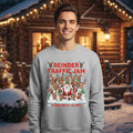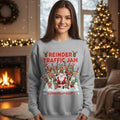 This Christmas, get ready for some holiday humor with the Reindeer Traffic Jam Christmas Sweater! Featuring Santa and a traffic jam of reindeer and elves, the sweater reads "Reindeer Traffic Jam – Sleigh Delay Alert!". It's the perfect way to bring laughs and fun to your Christmas celebration, as Santa tries to get his sleigh moving through a chaotic jam of reindeer and holiday cheer.