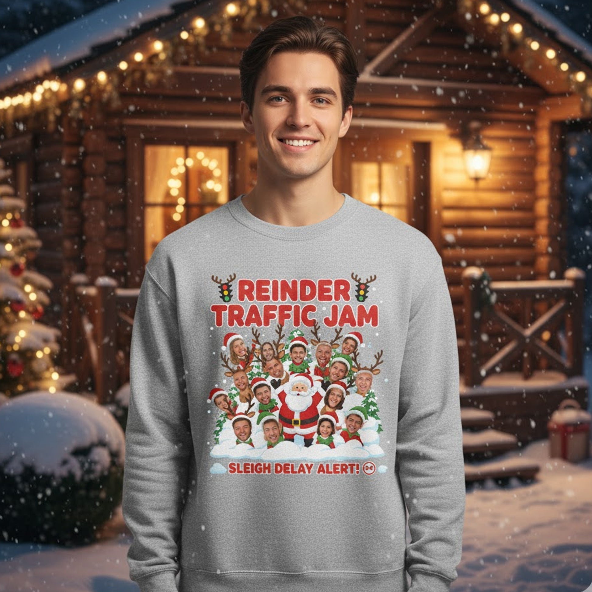 Reindeer Traffic Jam Ugly Christmas Sweater – Customizable Photo, Funny Holiday Jumper, Sleigh Delay Alert! | Ugly 110