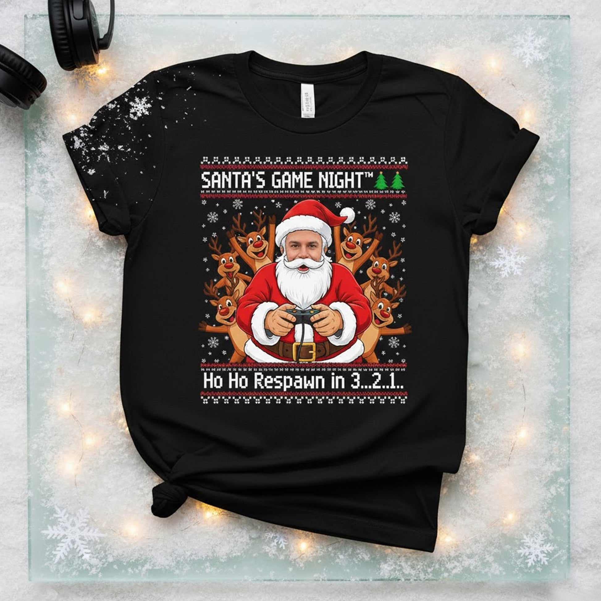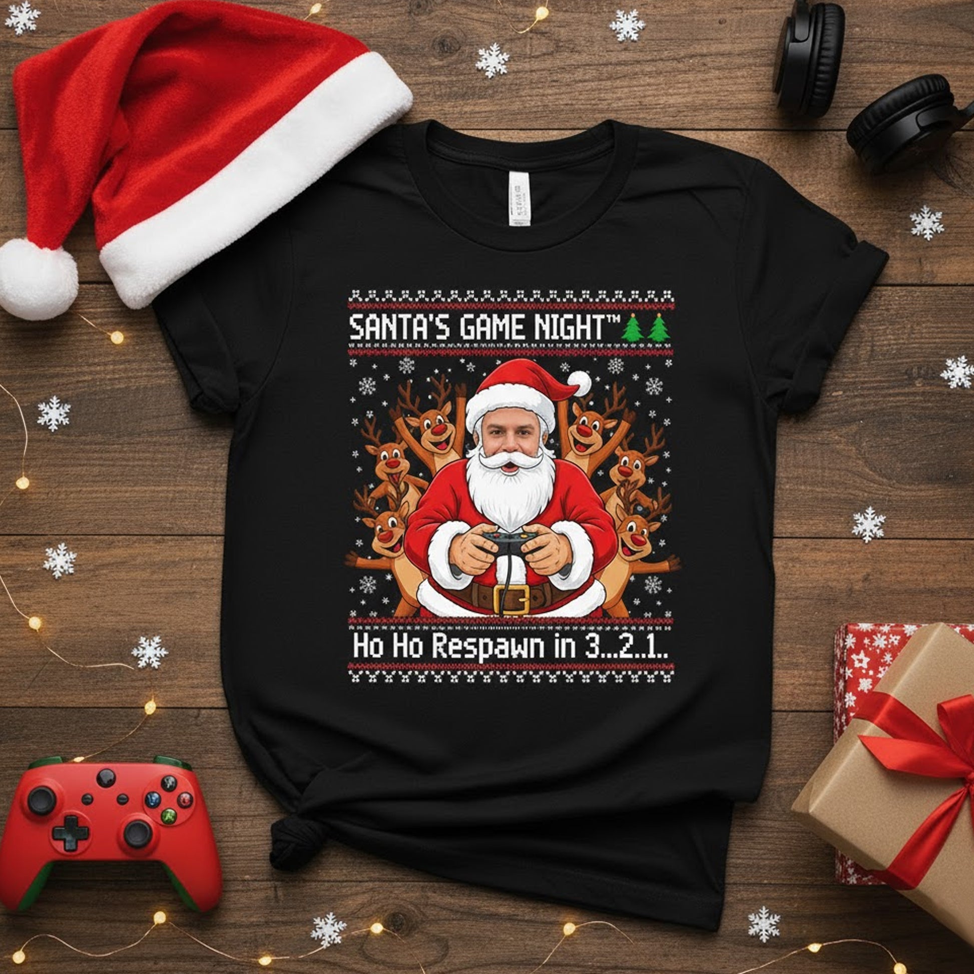 Design: “Santa’s Game Night – Ho Ho Respawn in 3…2…1” with your photo customized as Santa