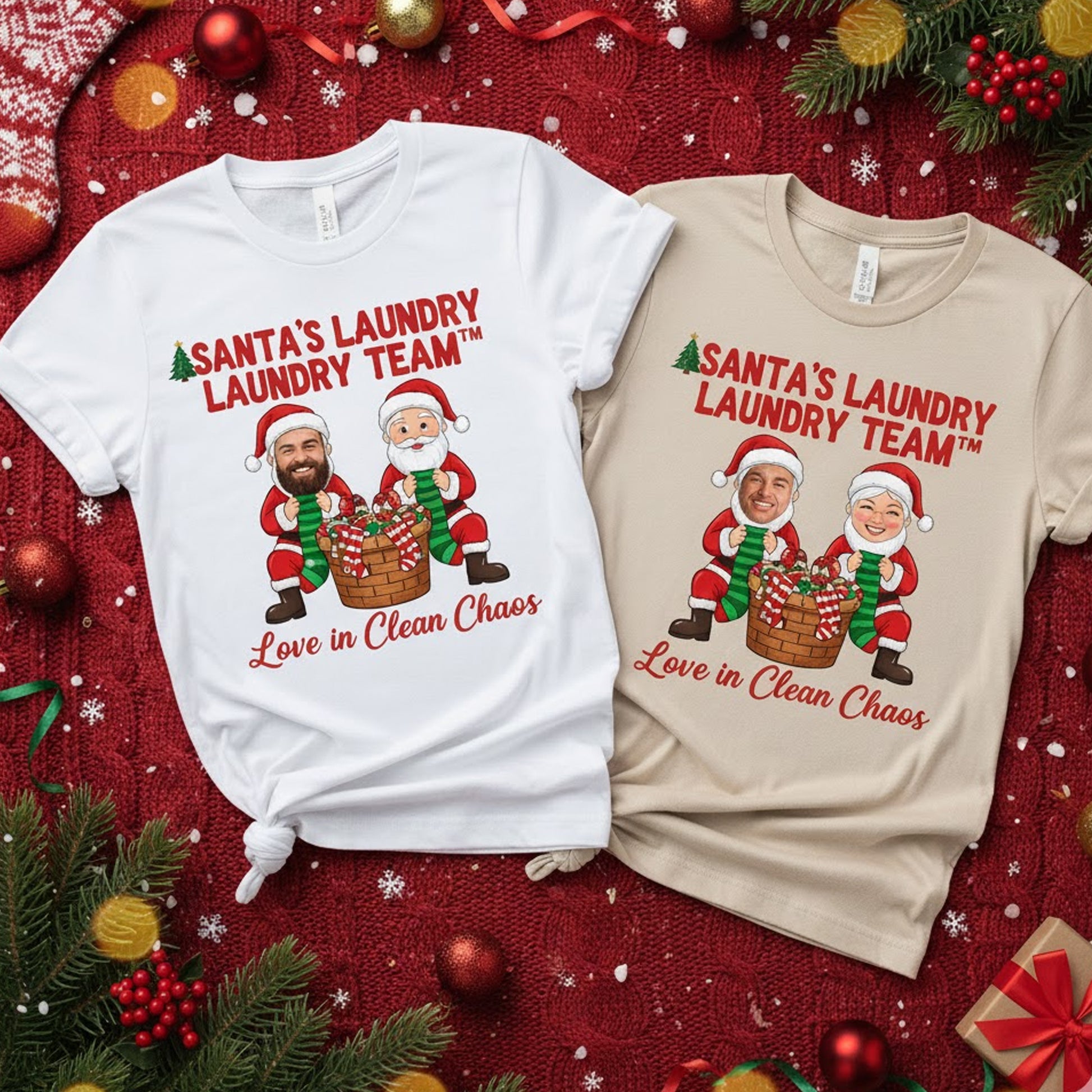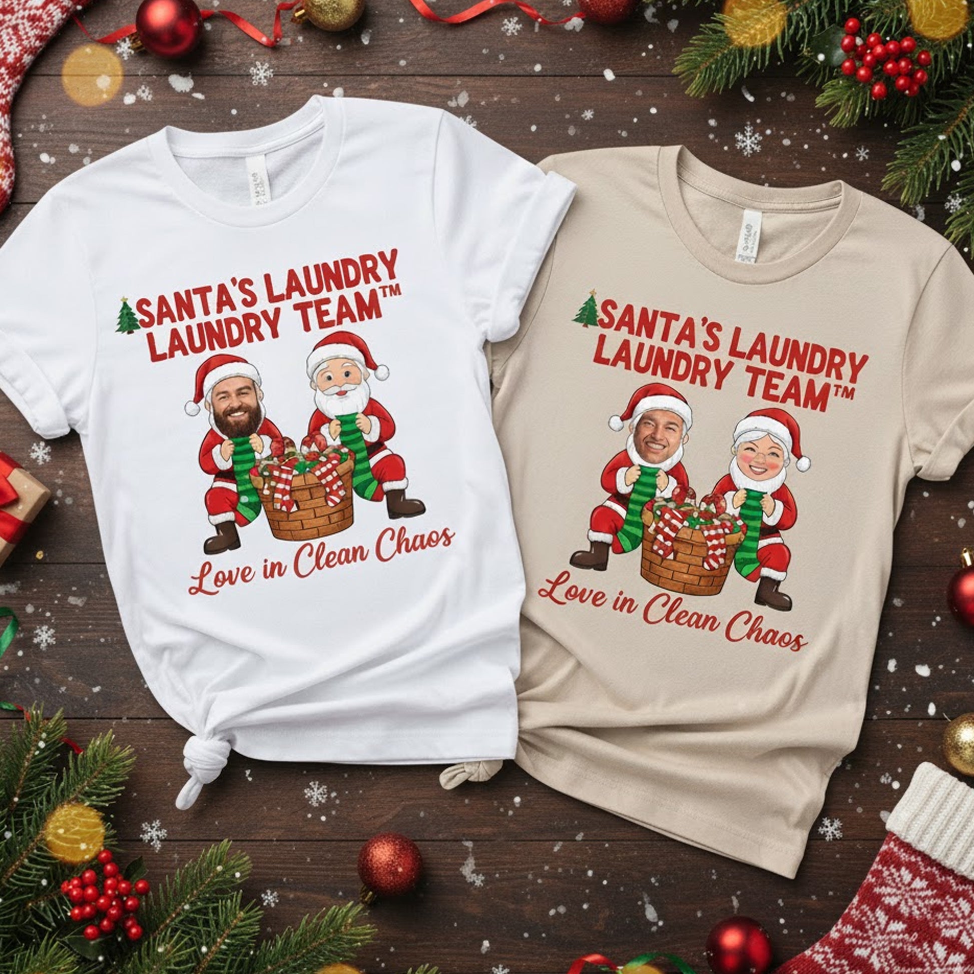 Design: “Santa’s Laundry Laundry Team™ – Love in Clean Chaos” with custom photo placement on characters’ faces