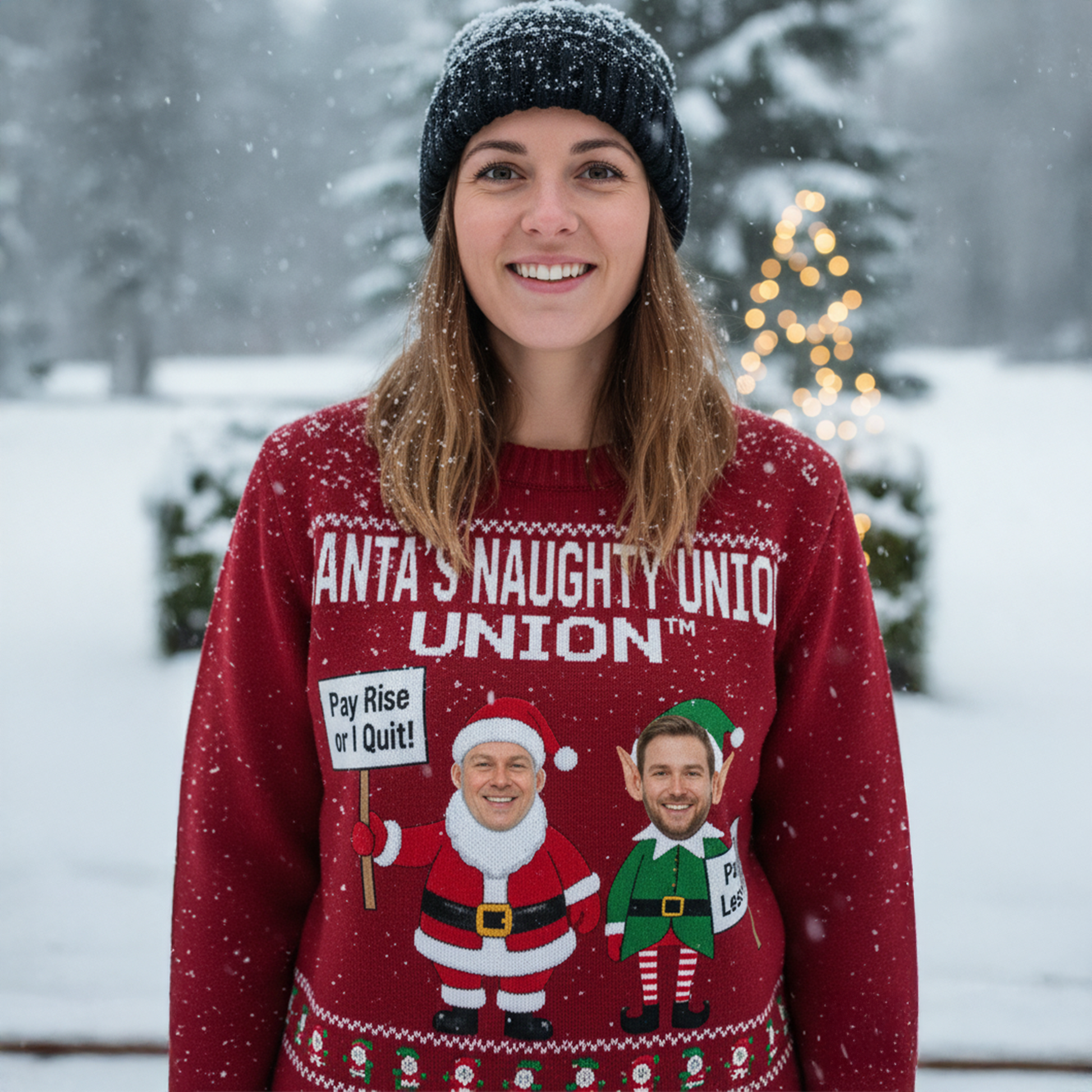 Santa's crew is striking! With the classic slogan “Pay Rise or I Quit” and “More Cocoa, Less Work”, the North Pole's elves are demanding better perks, and who can blame them? This hilarious Santa’s Naughty Union sweater features Santa and his rebellious elves spreading the Christmas cheer. Add your custom photo to make it truly yours!