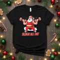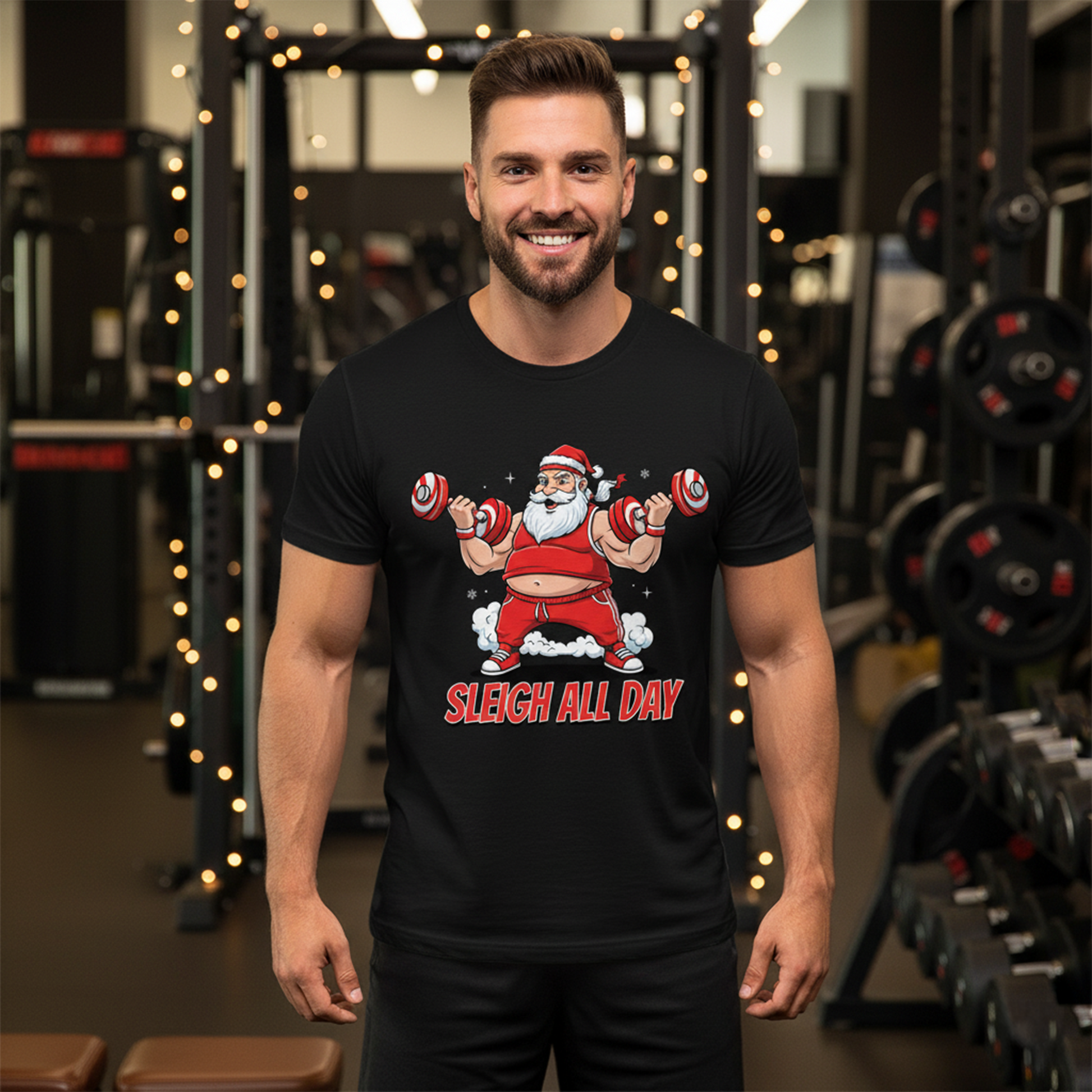 Bring holiday spirit to your workouts with the Sleigh All Day Santa T-Shirt — where Christmas meets fitness! 🎄