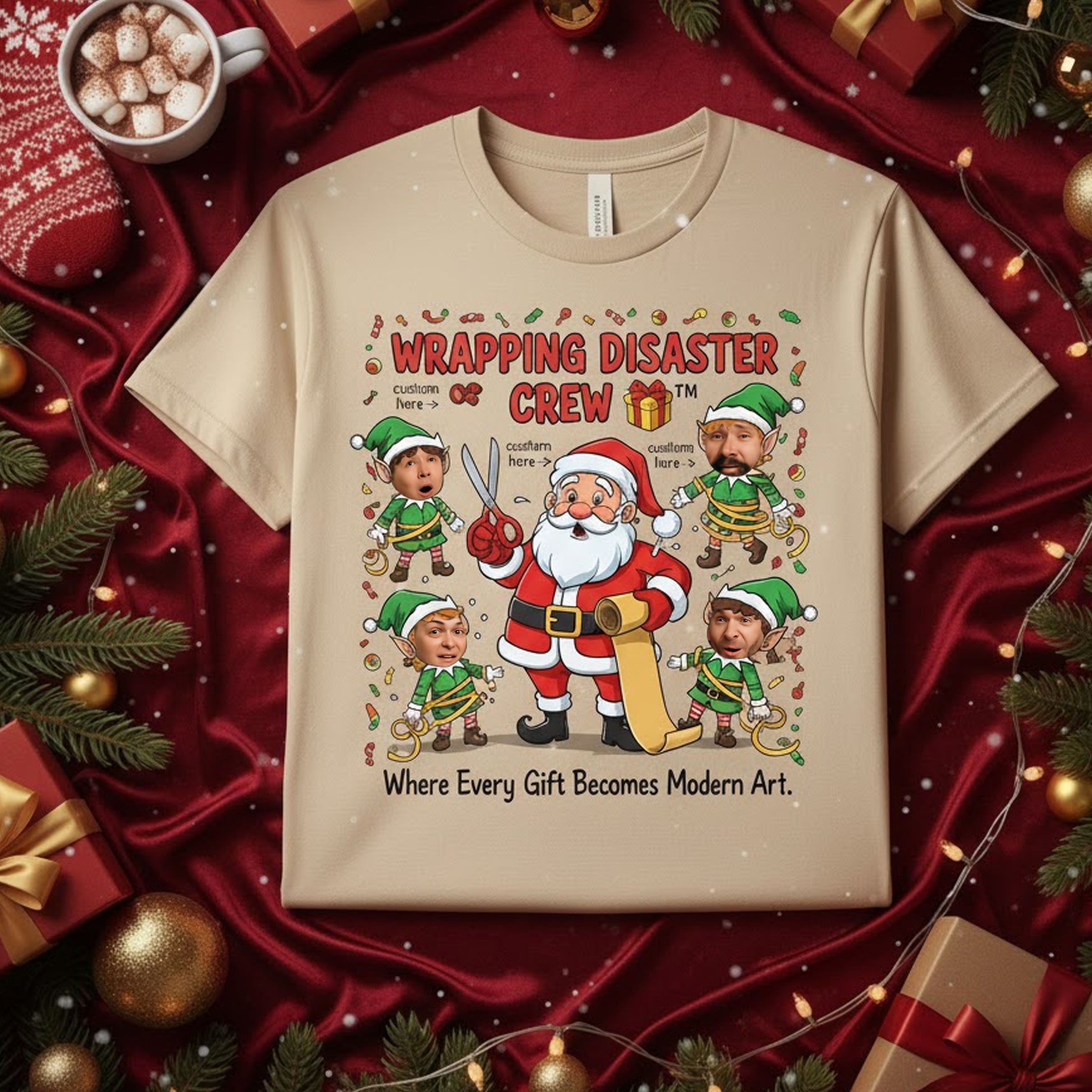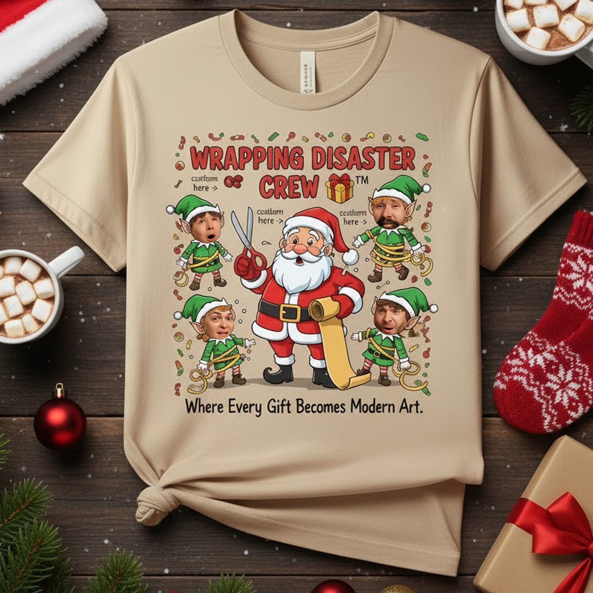 🎄 Become part of the Wrapping Disaster Crew™ — upload your photos and create your Custom Christmas T-Shirt today!